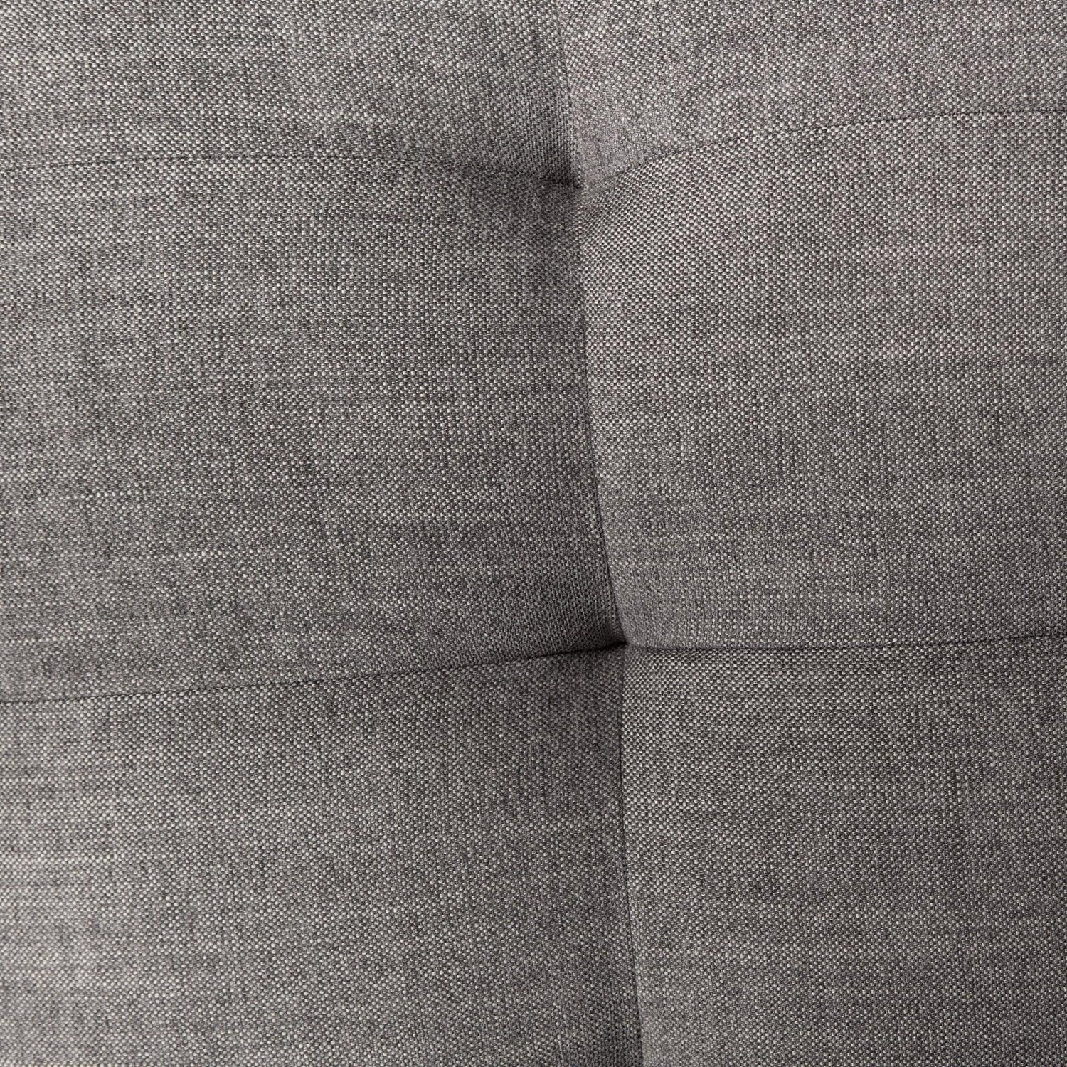 - Una cabecera baja con mechones capitoné en gris texturizado se combina con una sencilla base de hierro color bronce.