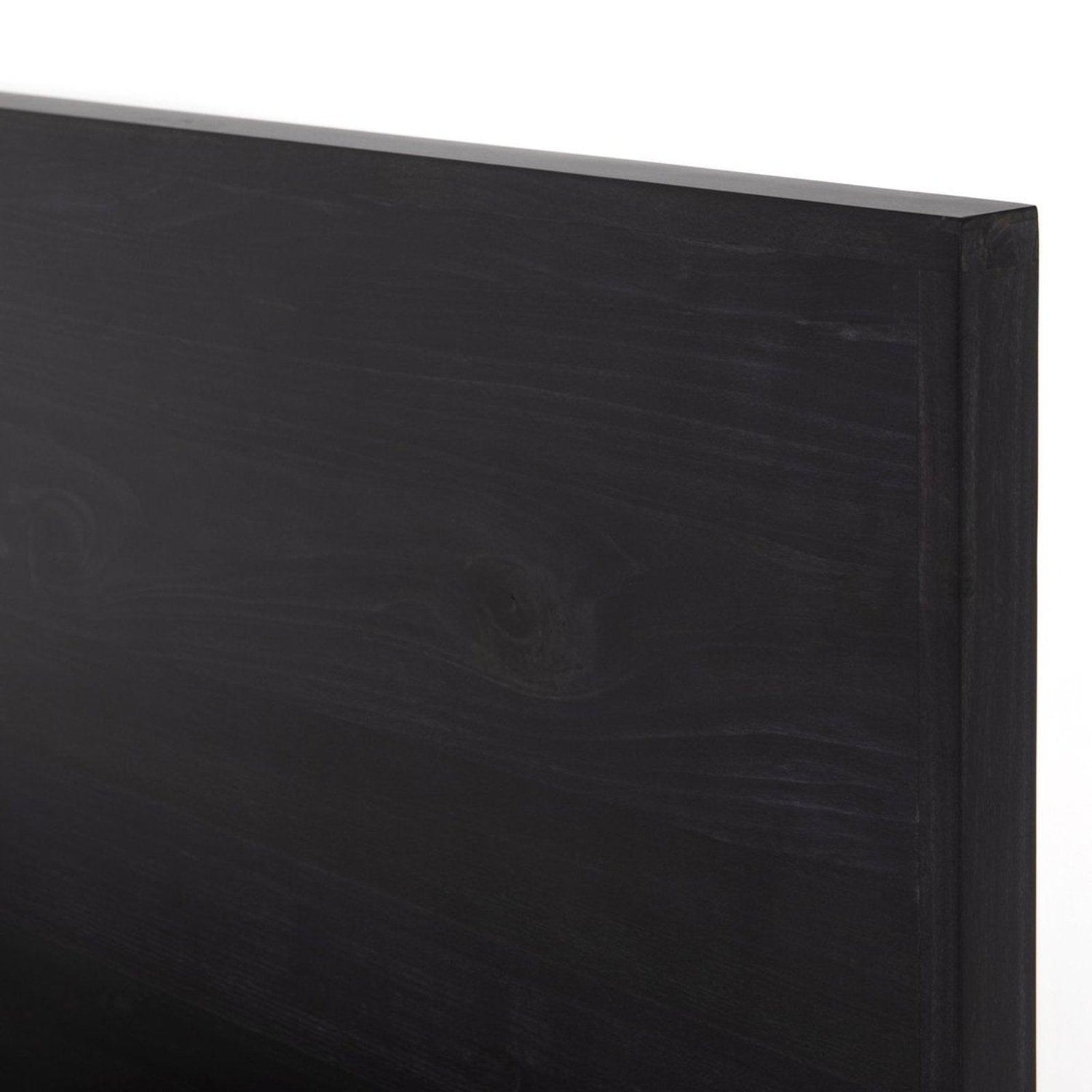 - Una cama de plataforma sencilla y elegante inspirada en el diseño limpio de mediados de siglo, elaborada con álamo con acabado castaño rojizo/álamo lavado en negro para una sensación de vanguardia.