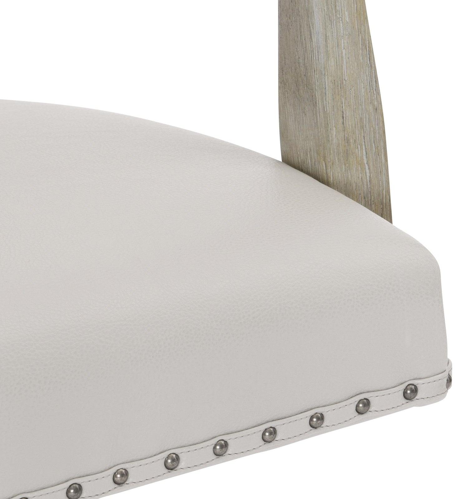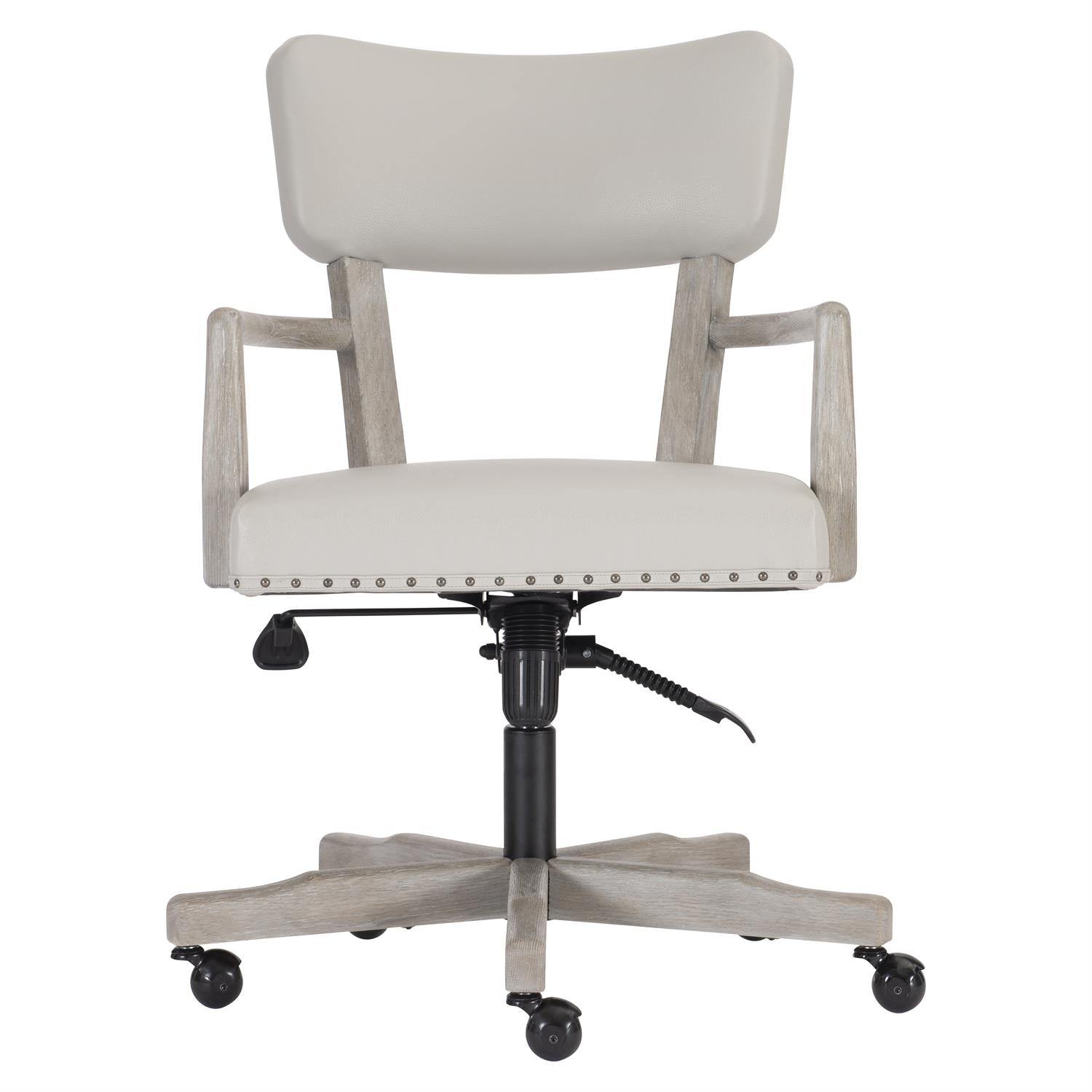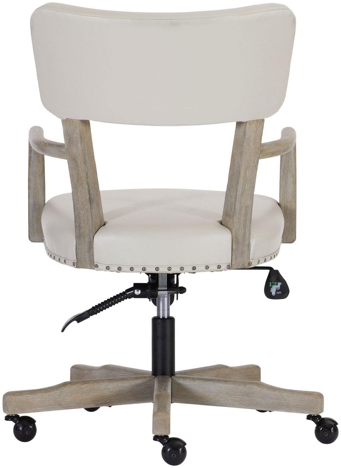 - Los brazos de madera expuestos y una base giratoria de madera única están terminados con un peltre rústico, mientras que un panel posterior y un asiento tapizados brindan comodidad durante todo el día.