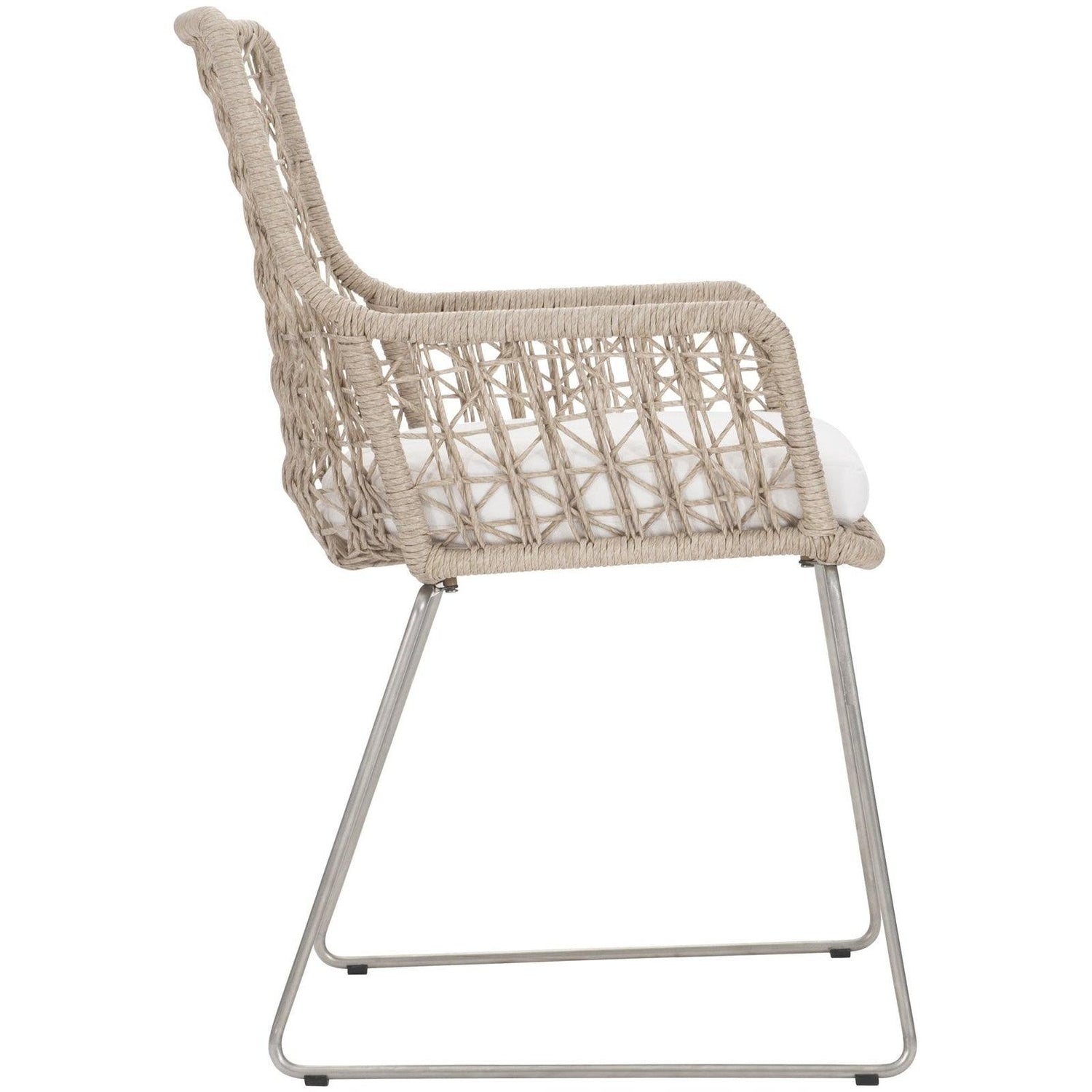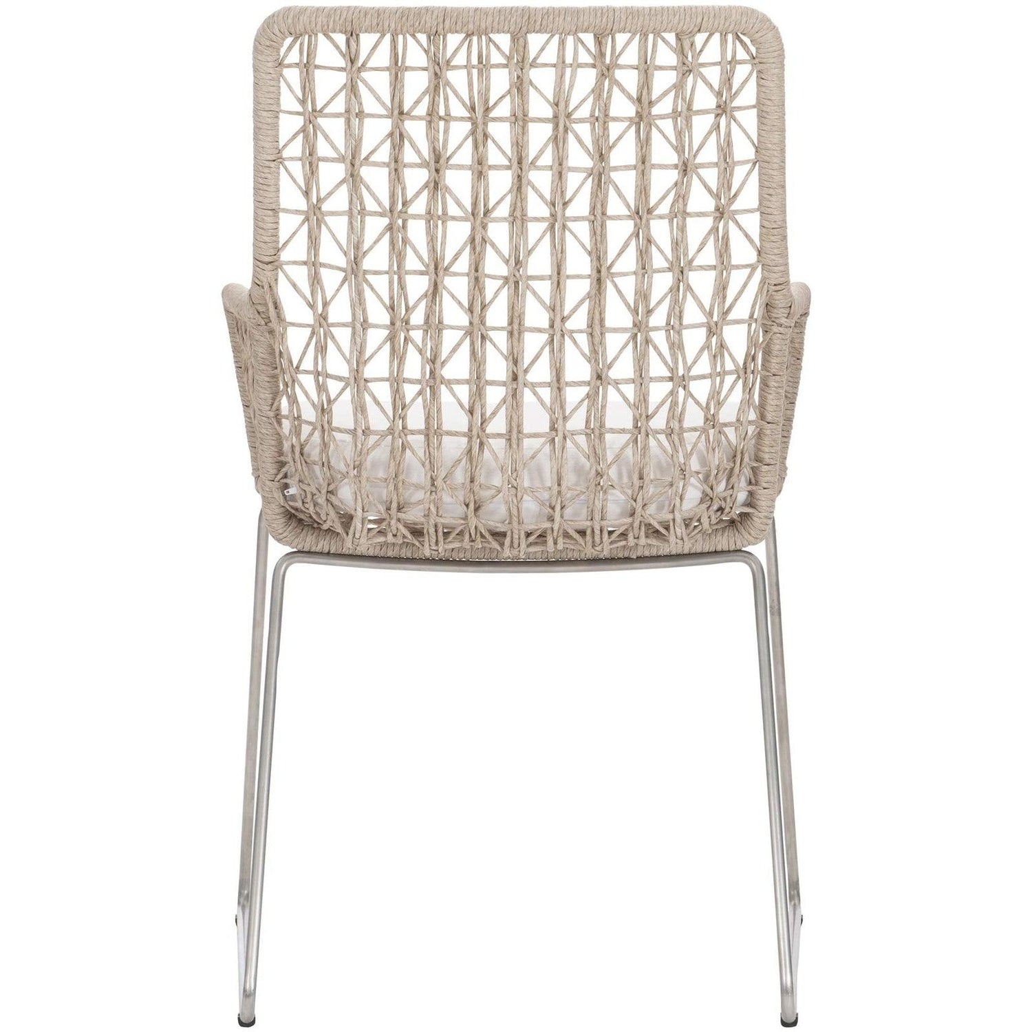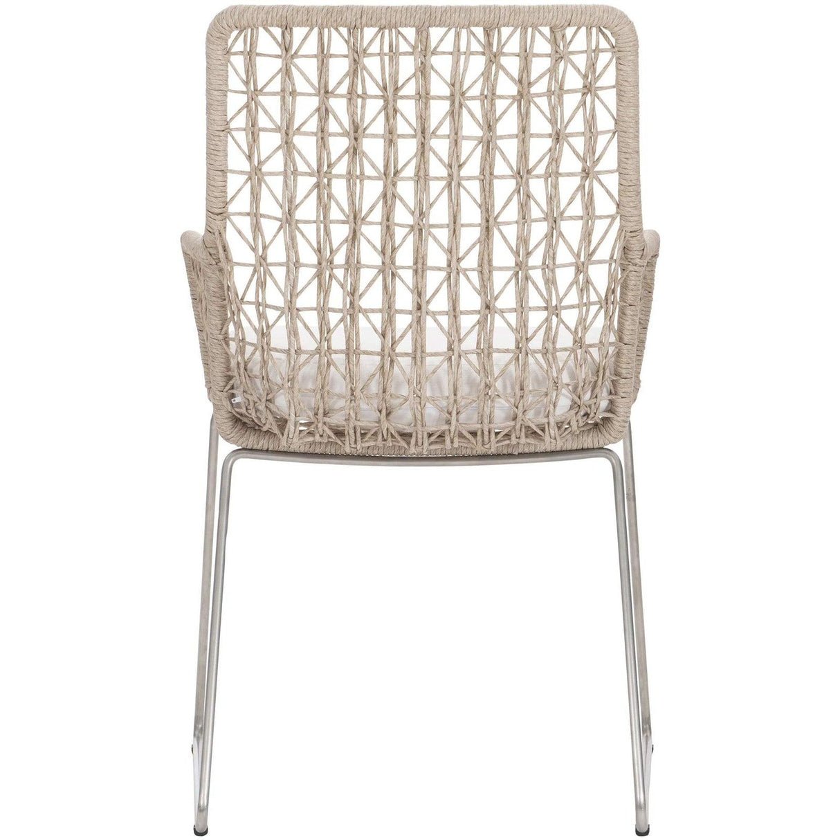 - Un tejido abierto distintivo crea un diseño sorprendente en esta silla de comedor para exterior.