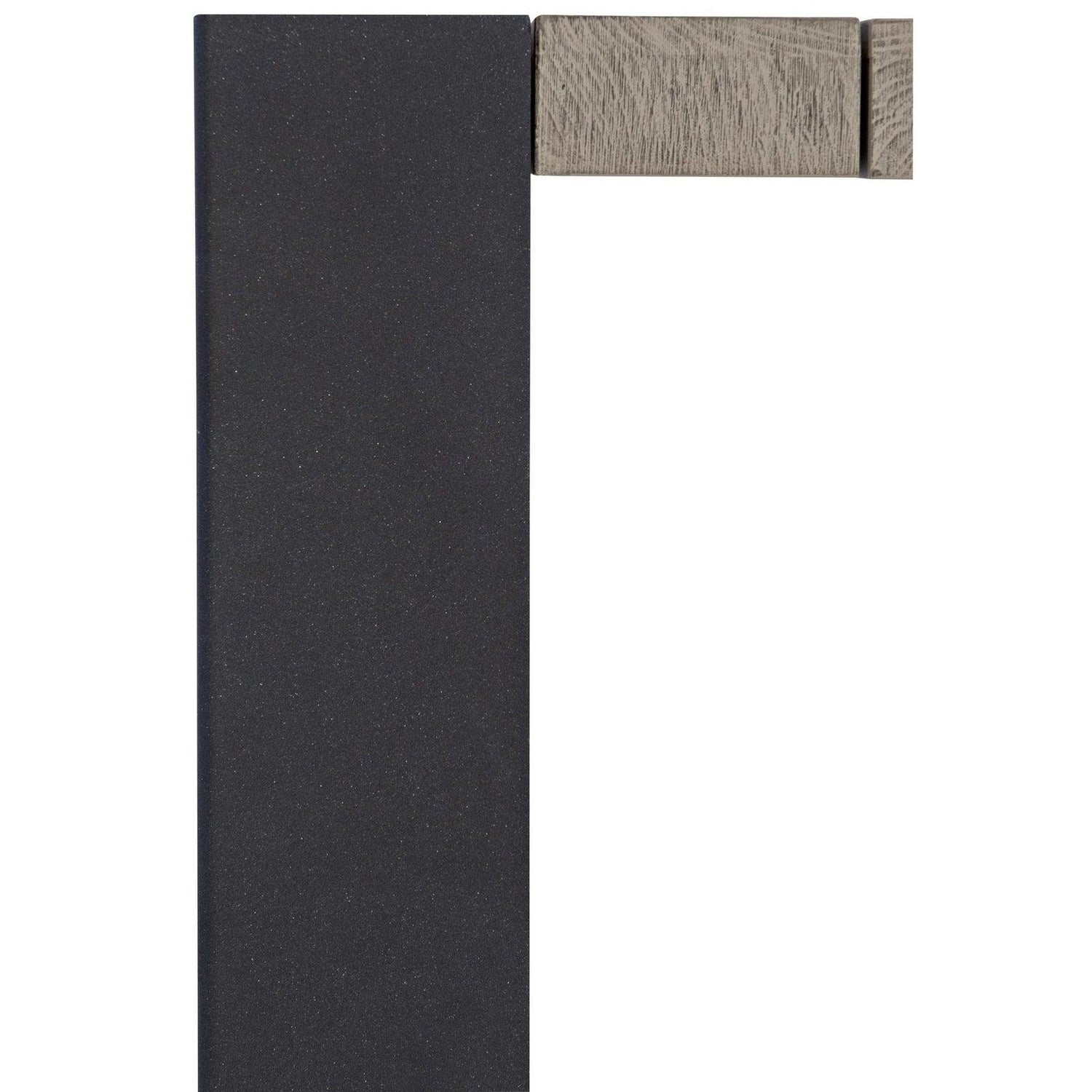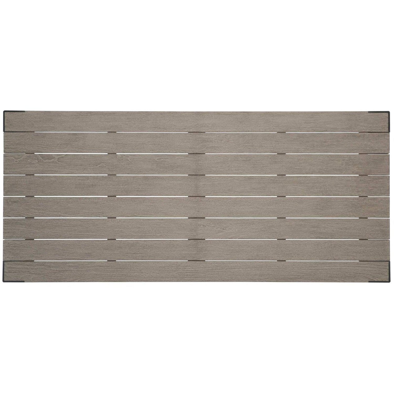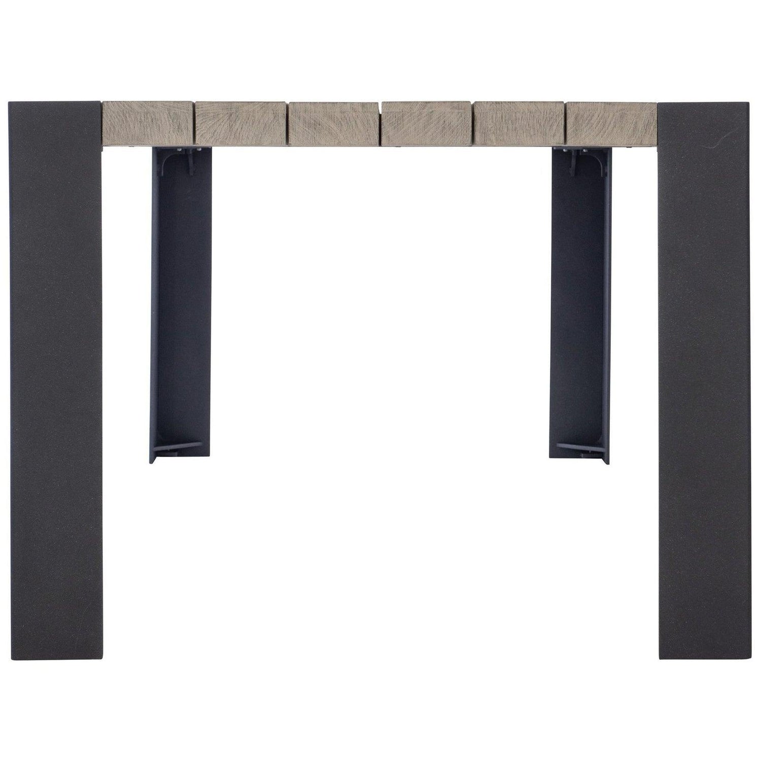 - La clásica superficie de tablones está hecha de madera de teca con un acabado desgastado, que contrasta con las patas de aluminio en forma de L con un acabado color carbón.