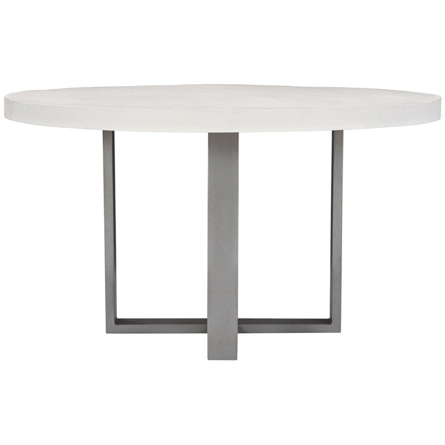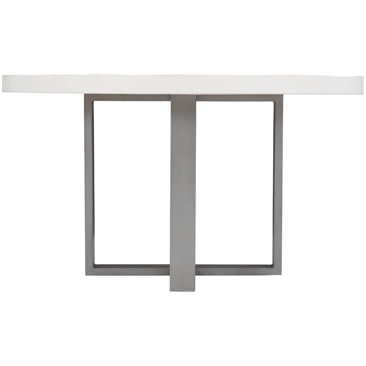 La mesa de comedor redonda para exteriores Del Mar de Bernhardt Furniture combina una superficie de hormigón fundido de 137 cm con acabado hueso y una base de acero inoxidable con recubrimiento en polvo en gris sílex. Perteneciente a la colección Bernhardt Exteriors, esta moderna mesa de comedor para exteriores combina durabilidad con un diseño refinado, lo que la hace ideal para patios, terrazas y comedores de lujo al aire libre.