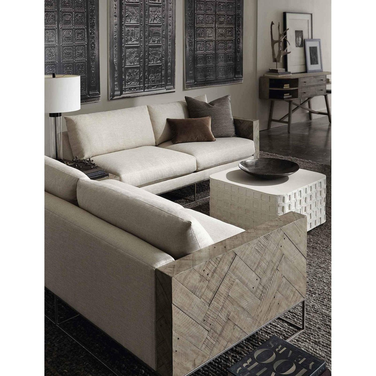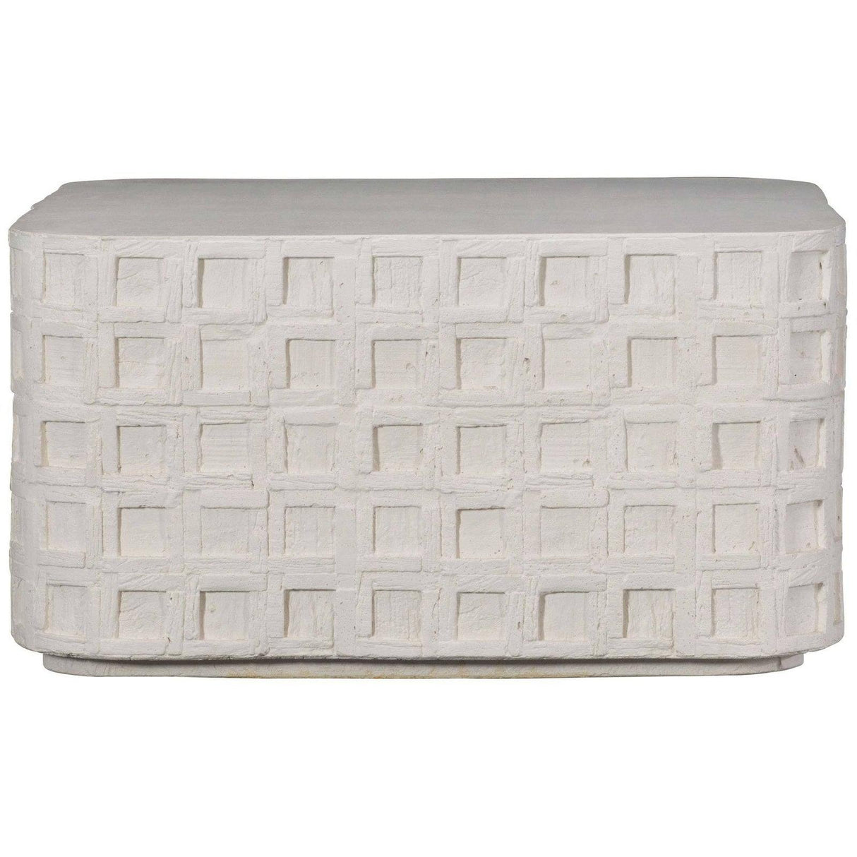 - Un patrón geométrico de cuadrados empotrados crea dimensión, mientras que una base de zócalo delgada agrega un detalle arquitectónico sofisticado.