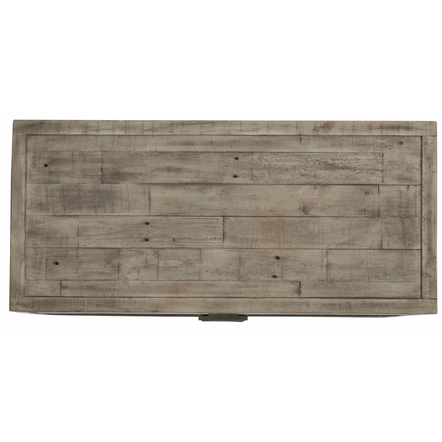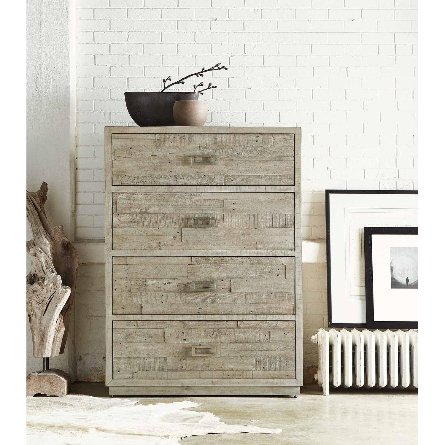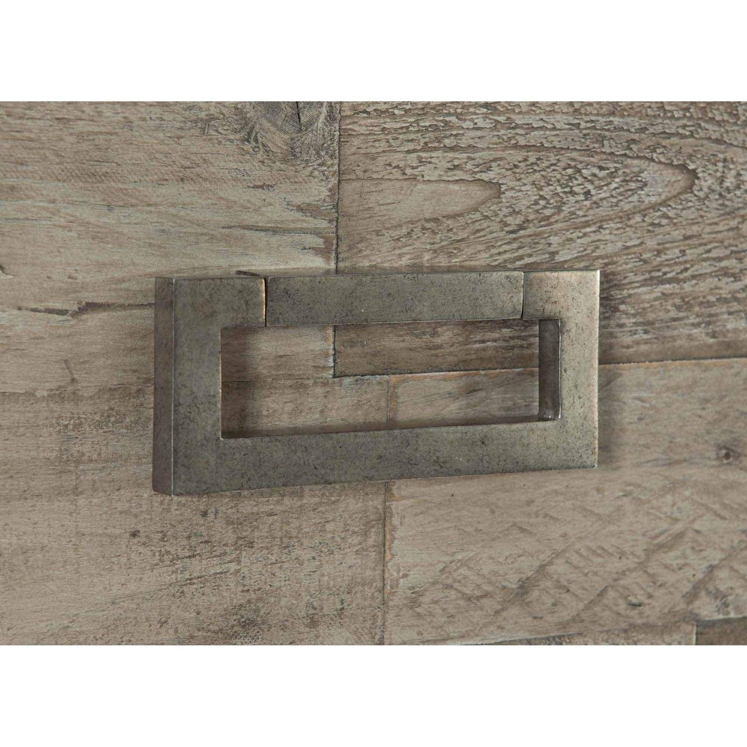 - Tablones de pino recuperado de diferentes longitudes y anchos crean dimensión y dan la sensación de un objeto encontrado.