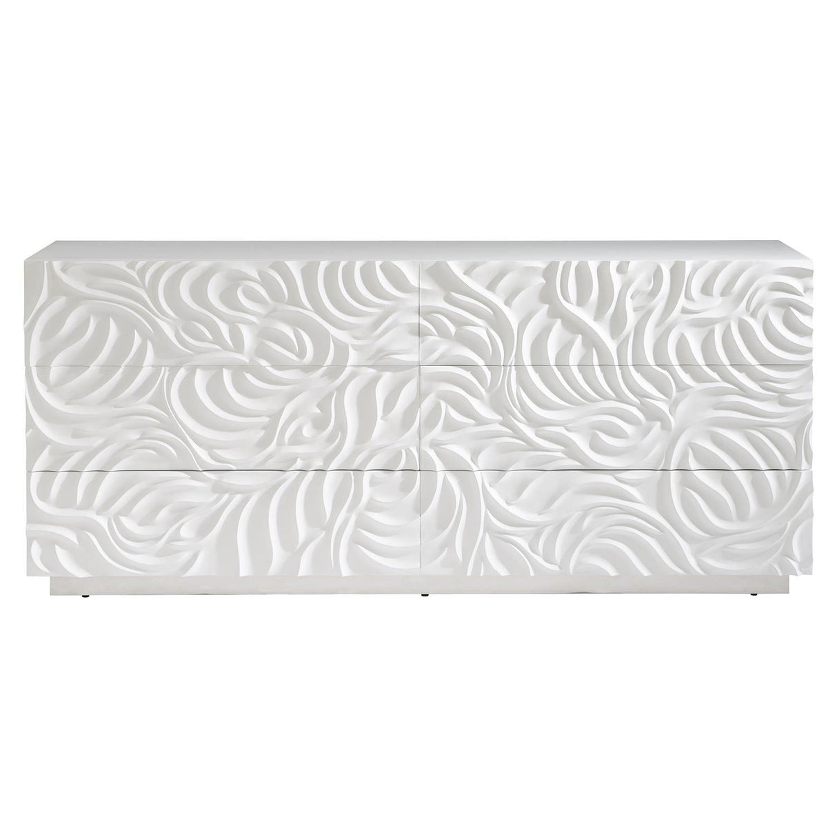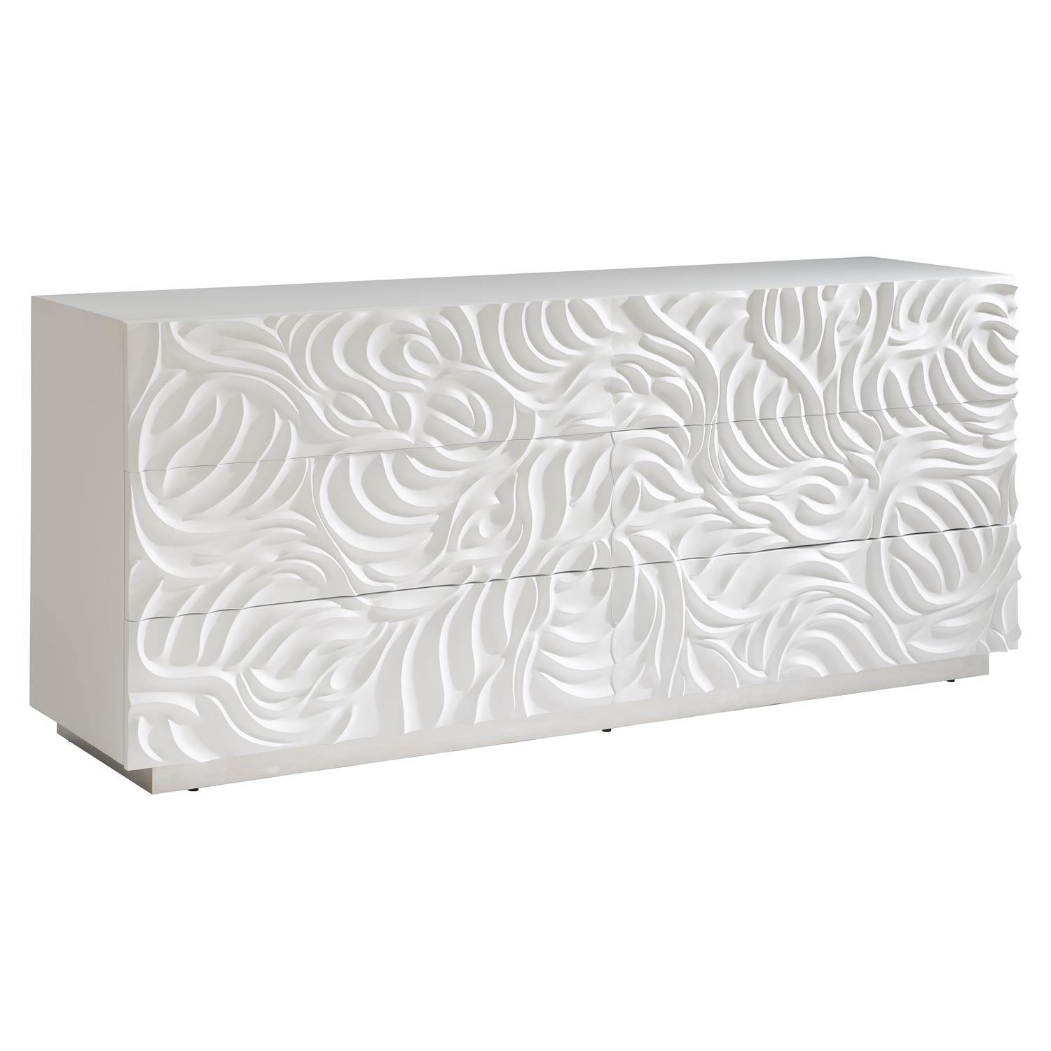La cómoda Alia de Bernhardt Furniture encarna una estética orgánica moderna con frentes de cajones profundamente tallados que crean movimiento y textura naturales. Con un luminoso acabado en yeso blanco, sus esculturales espirales evocan conchas exóticas o peonías en flor, convirtiendo esta cómoda de seis cajones en una auténtica pieza destacada para interiores sofisticados.