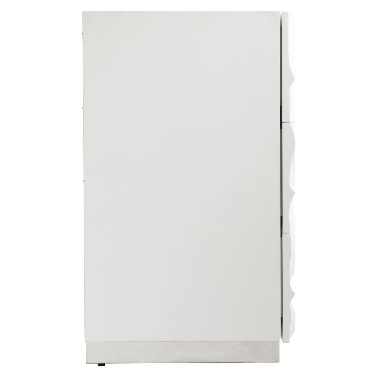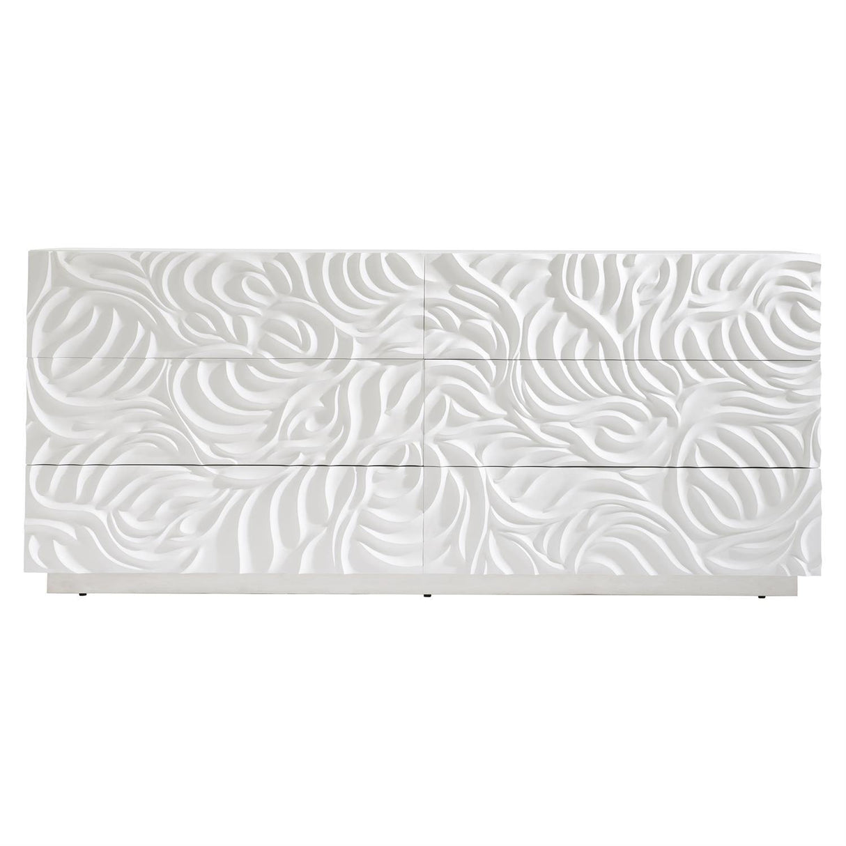 Fabricado con base de zócalo de acero inoxidable pulido y frentes de cajón de resina tallada con acabado de yeso blanco. Textura, movimiento y maestría convergen en este diseño.