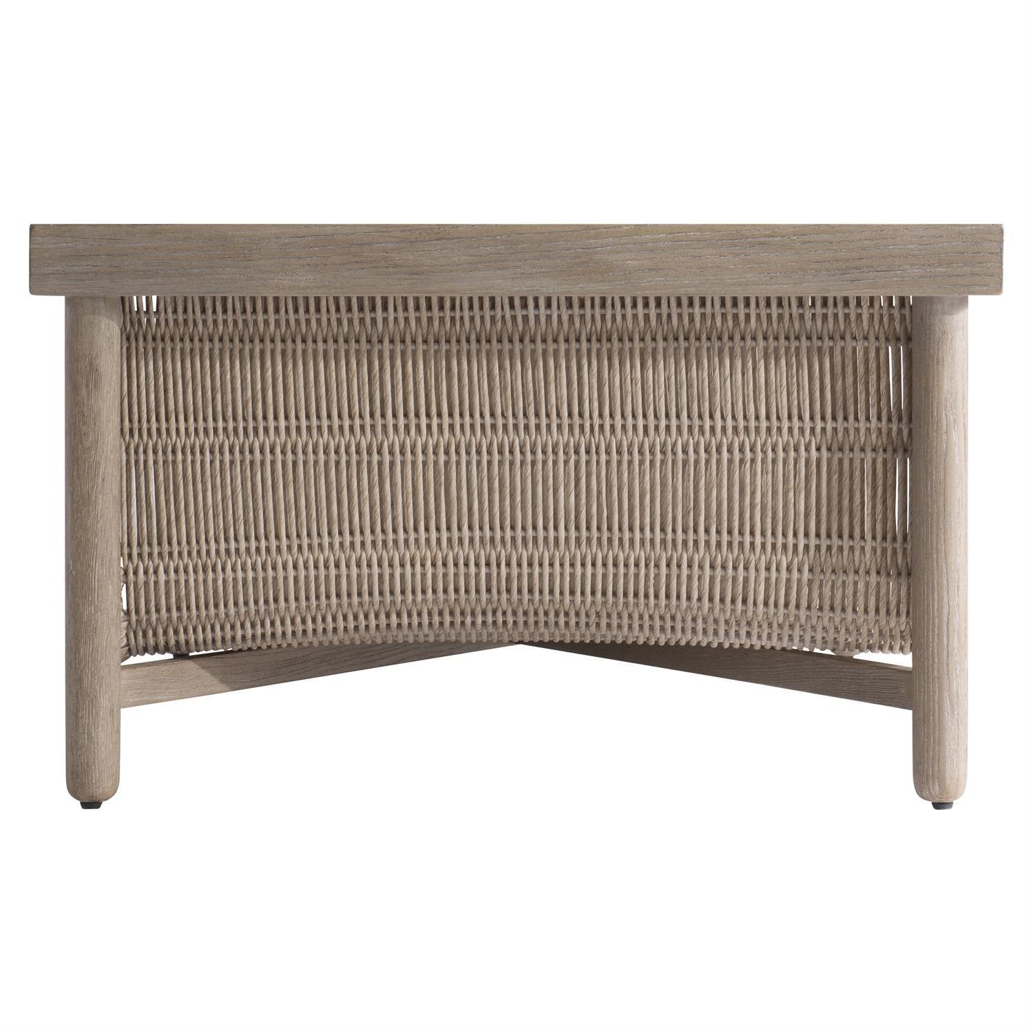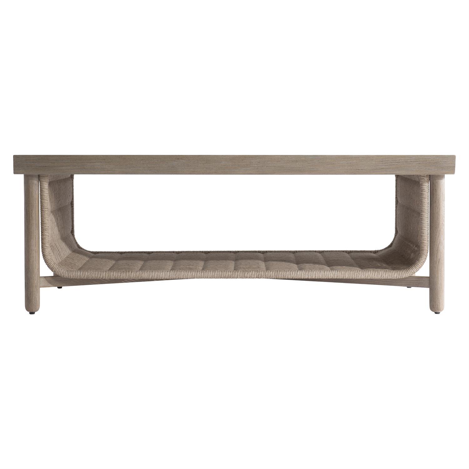 Una cuerda trenzada y tejida forma un estante en forma de U sobre la singular mesa de cóctel Santiago. La parte superior y las patas están hechas de roble blanco macizo cuarteado y chapado en roble blanco con acabado Sandbar. Su magnífico diseño presenta una estética orgánica moderna con un estilo singular.