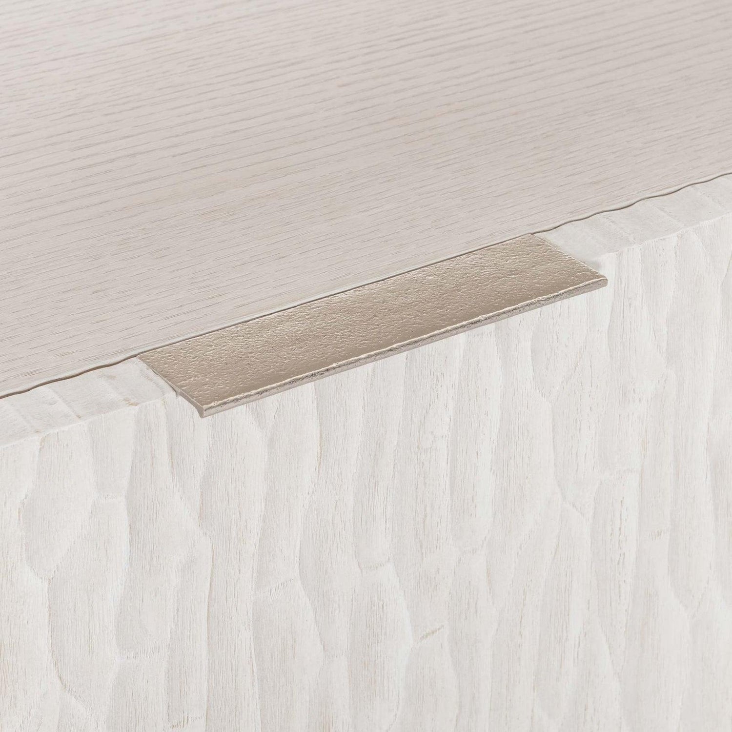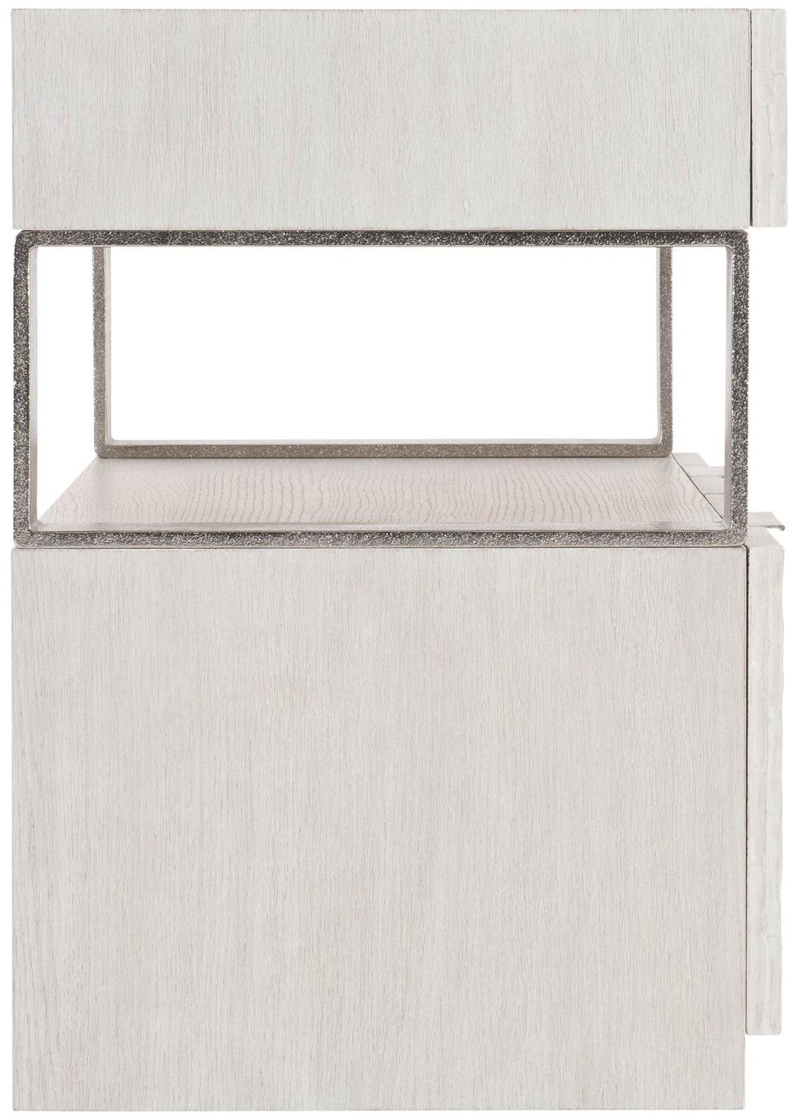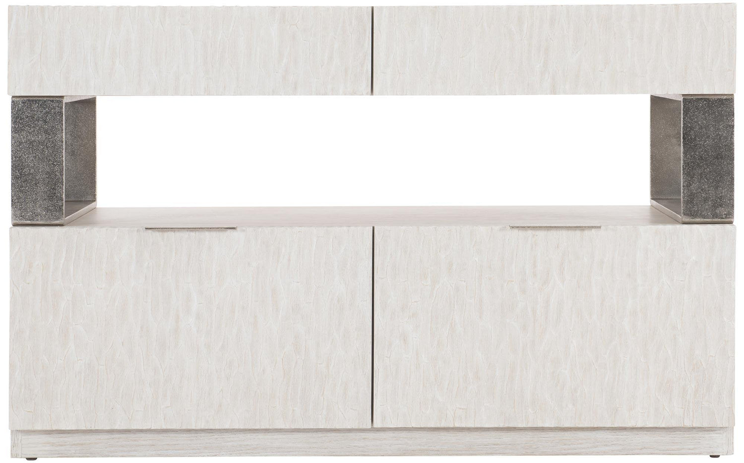 - Estante abierto entre cajones superiores e inferiores con soportes metálicos en acabado níquel brillante.