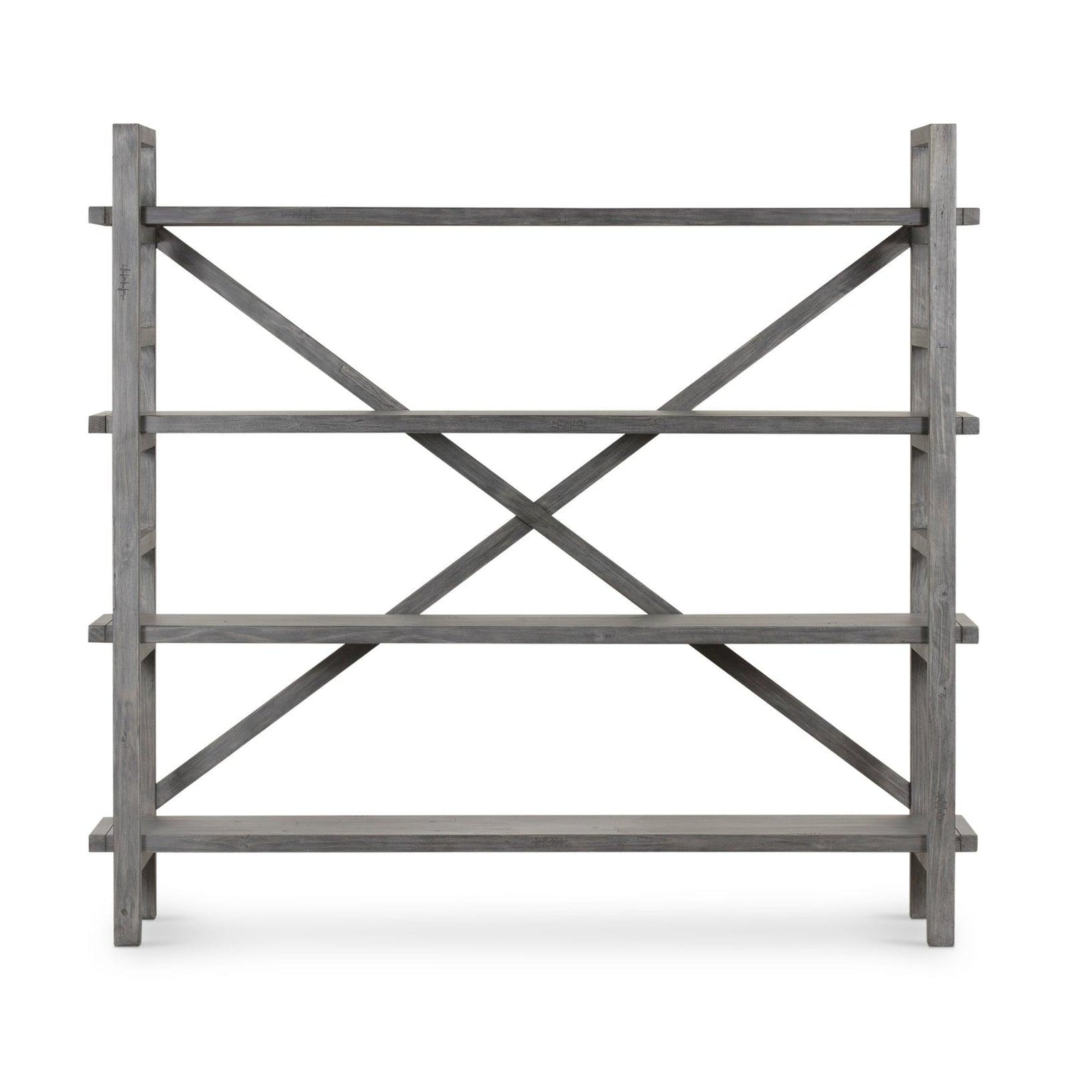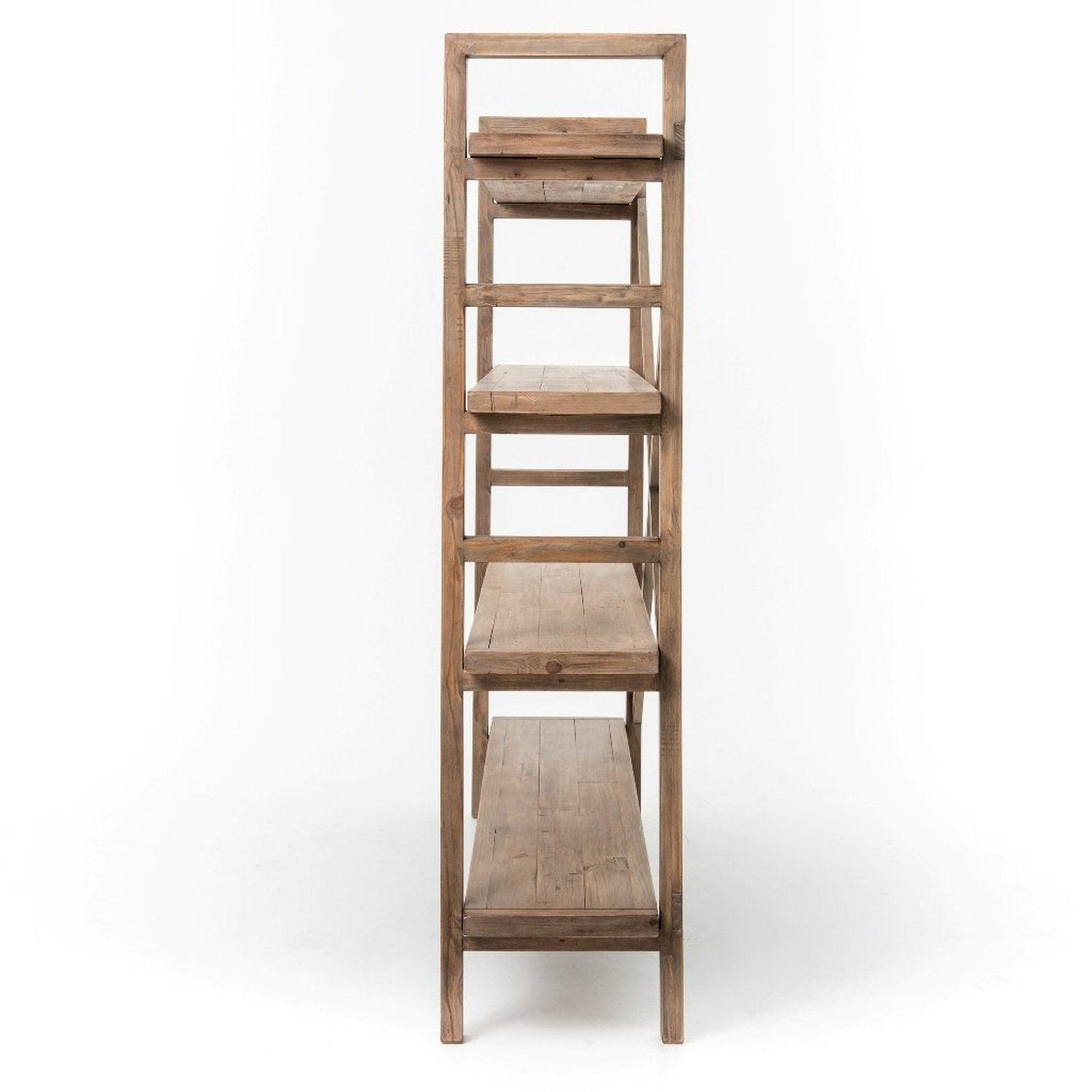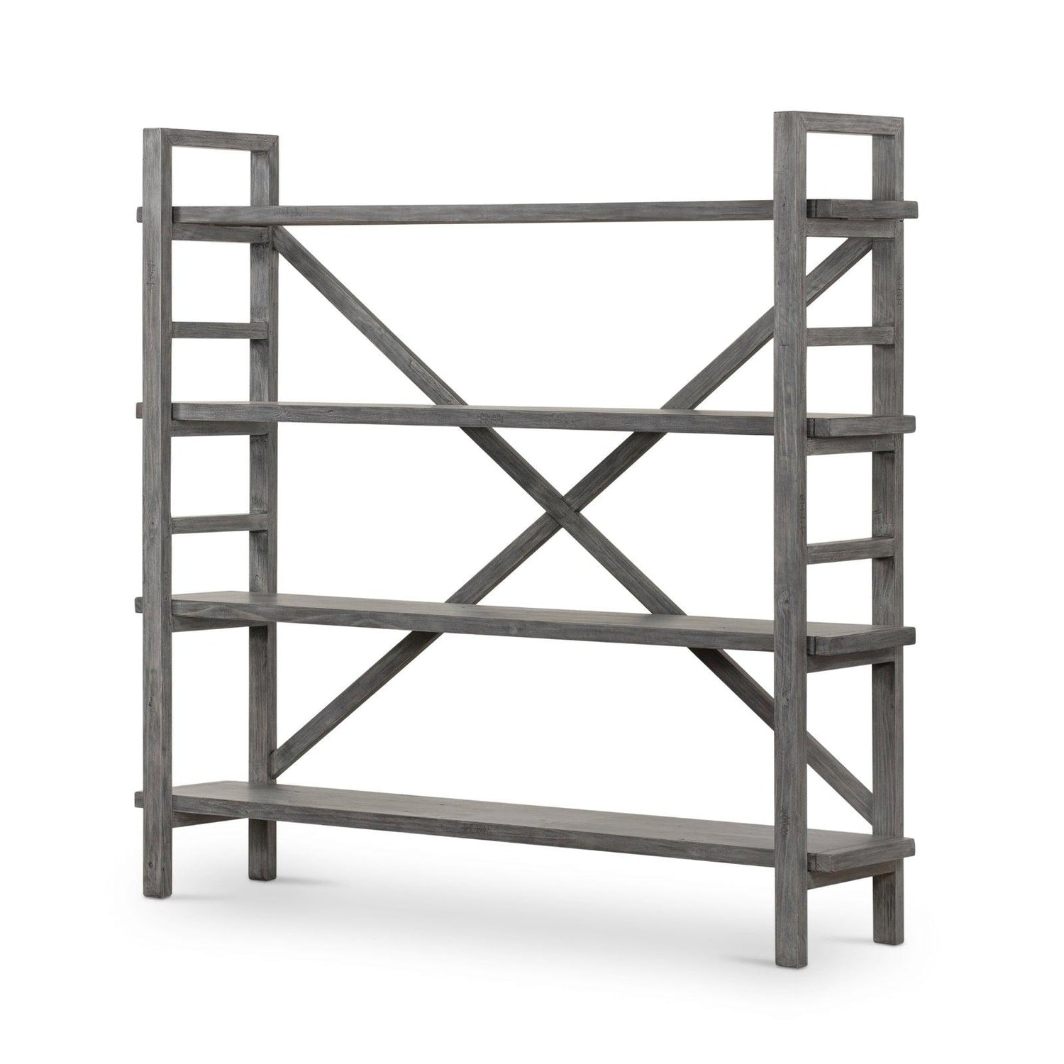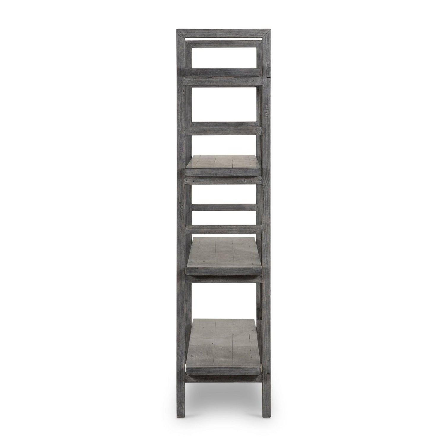 • Terminado en un gris lavado versátil, cuatro tablones móviles de maderas recuperadas mixtas se apilan para una exhibición abierta de tesoros personales.