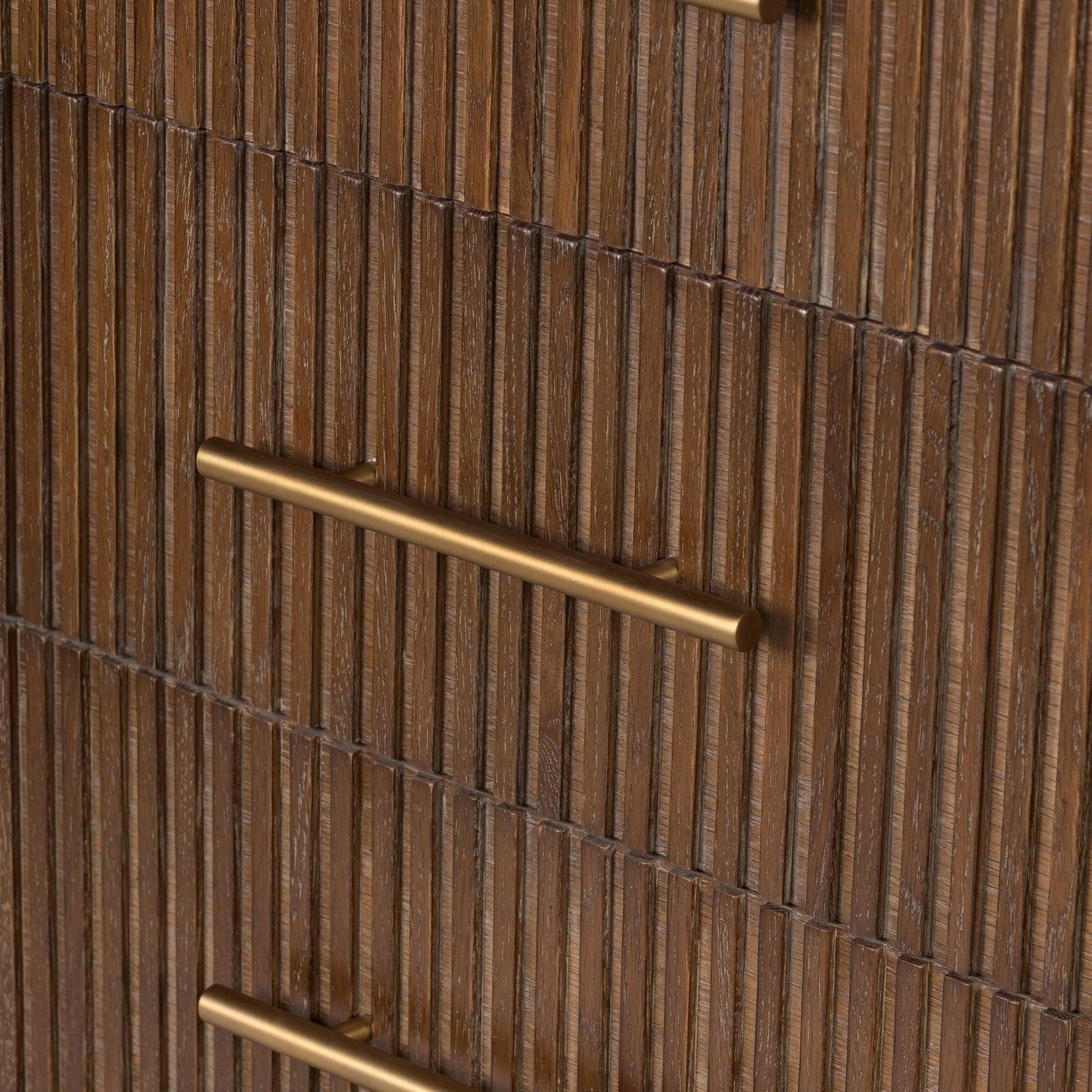 • Rico en lengüetas para una gran textura y una apariencia lineal, el roble macizo con acabado marrón hace alarde de cinco cajones espaciosos con herrajes de latón pulido y esquinas fríamente curvas, mientras que una cubierta de piedra azul aporta una mezcla de materiales maravillosamente complementaria al almacenamiento del dormitorio.