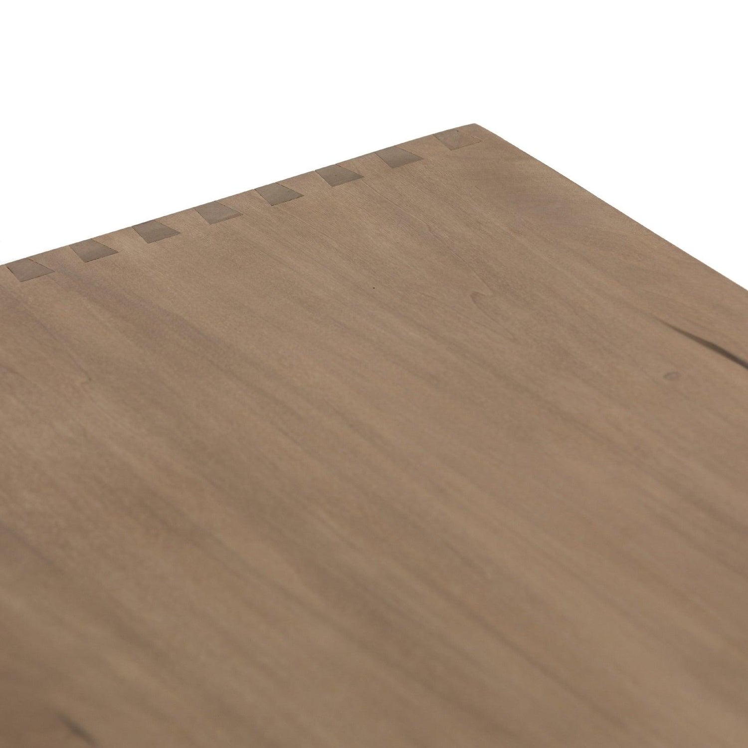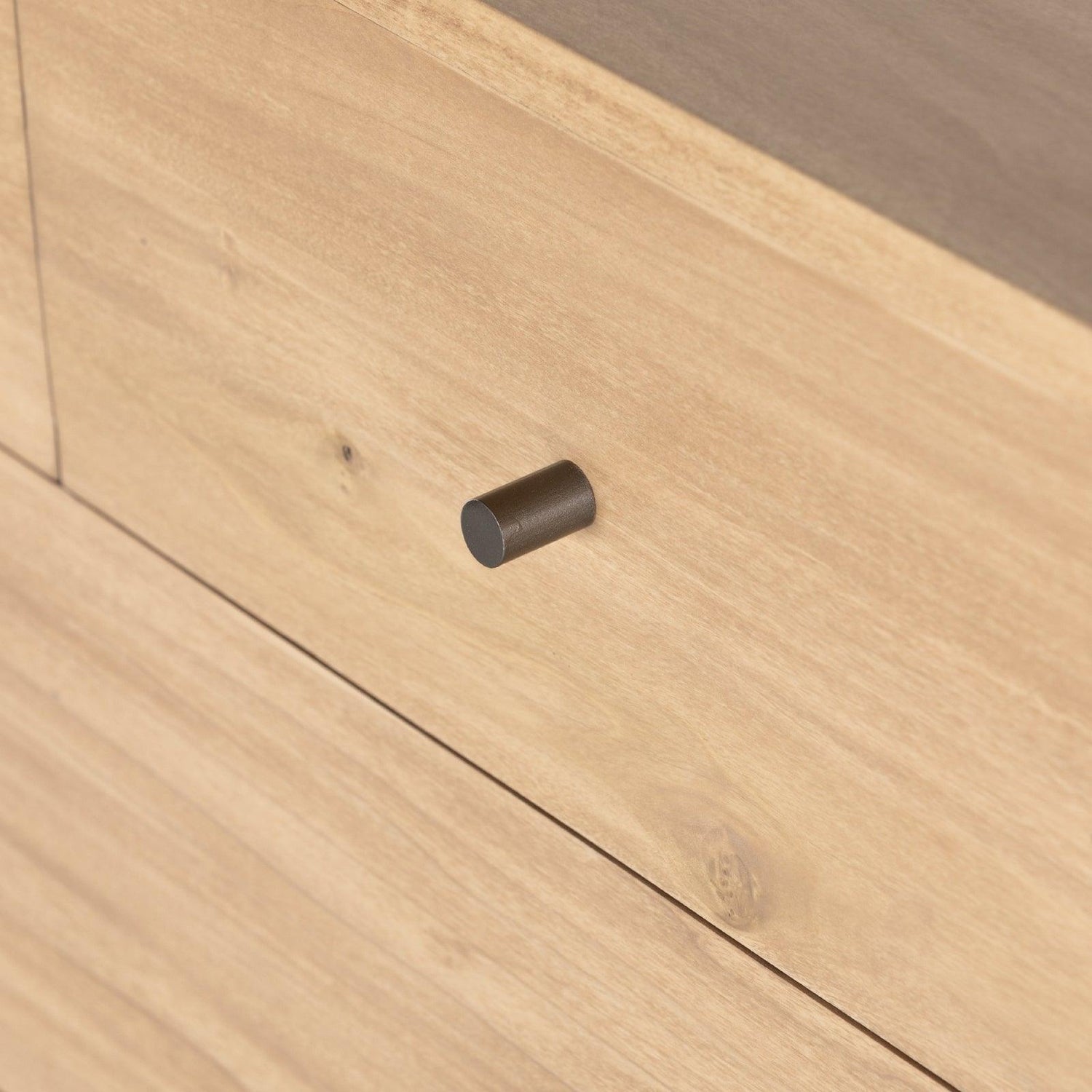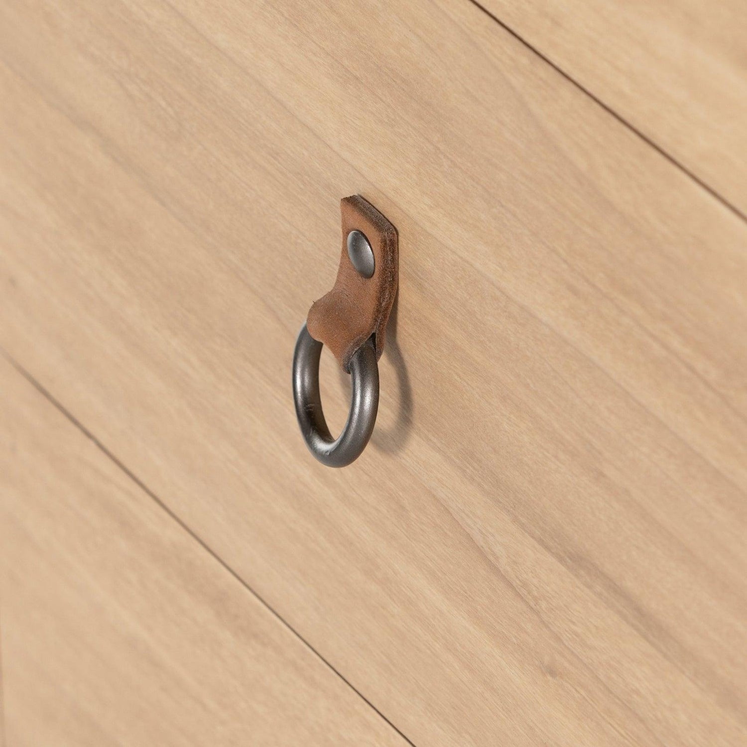 • El álamo macizo lavado en seco forma una cómoda alta de seis cajones, con uniones de cola de milano falsas y herrajes de hierro y cuero para una actualización fresca e impulsada por los materiales del estilo inspirado en Shaker.