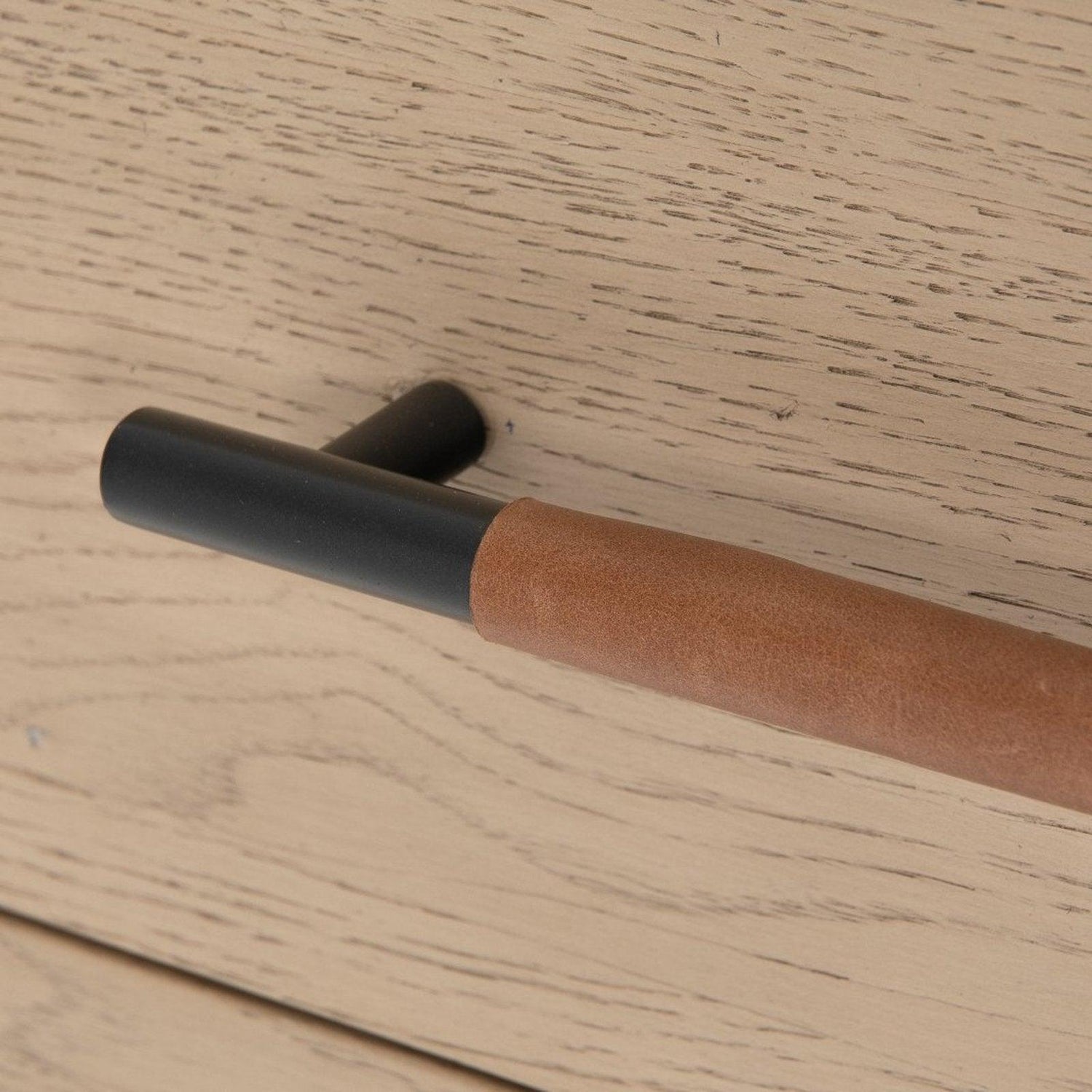 - El roble con acabado claro forma una silueta limpia para tres cajones espaciosos con herrajes de hierro envueltos en cuero de grano superior color tostado.