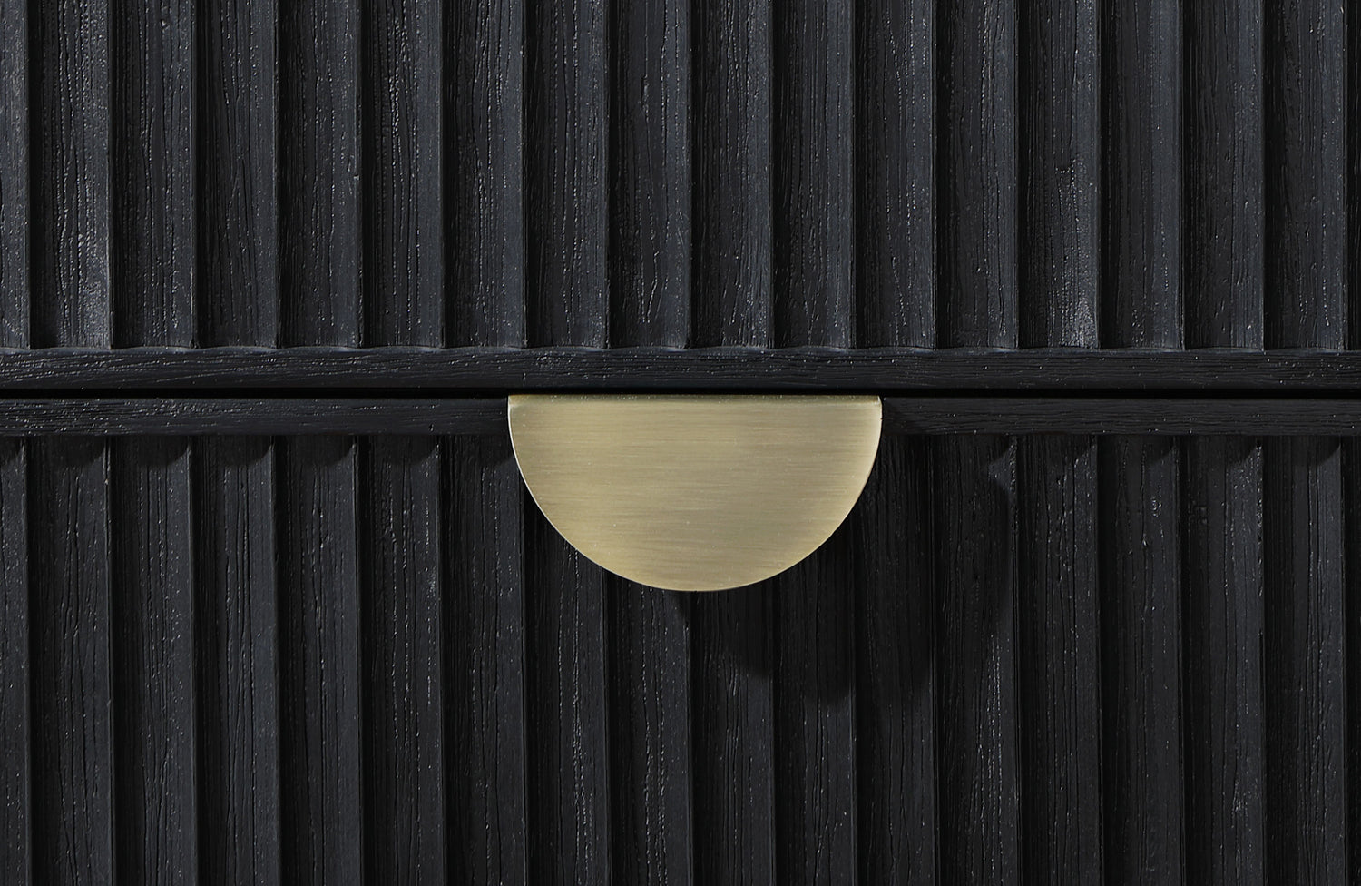 - Los cajones cuentan con tiradores metálicos en forma de media luna en un cálido tono dorado para un contraste sofisticado.