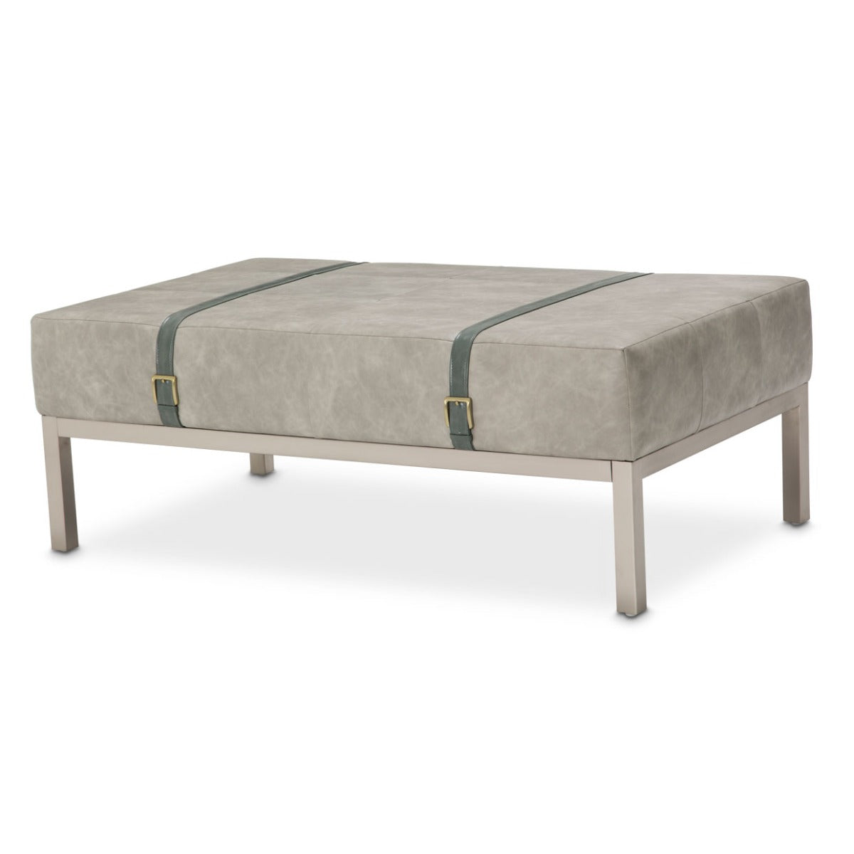 La otomana rectangular Menlo Station Cocktail de AICO ofrece una interpretación moderna del diseño industrial vintage con su tapizado de vinilo gris envejecido , correas de campaña en contraste y estructura de metal plateado cepillado . Ya sea como reposapiés, mesa de centro o elegante pieza central, esta otomana es perfecta para crear un espacio ecléctico y funcional en cualquier sala de estar o casa tipo loft. Su firme superficie acolchada y sus materiales únicos la hacen versátil y atractiva.