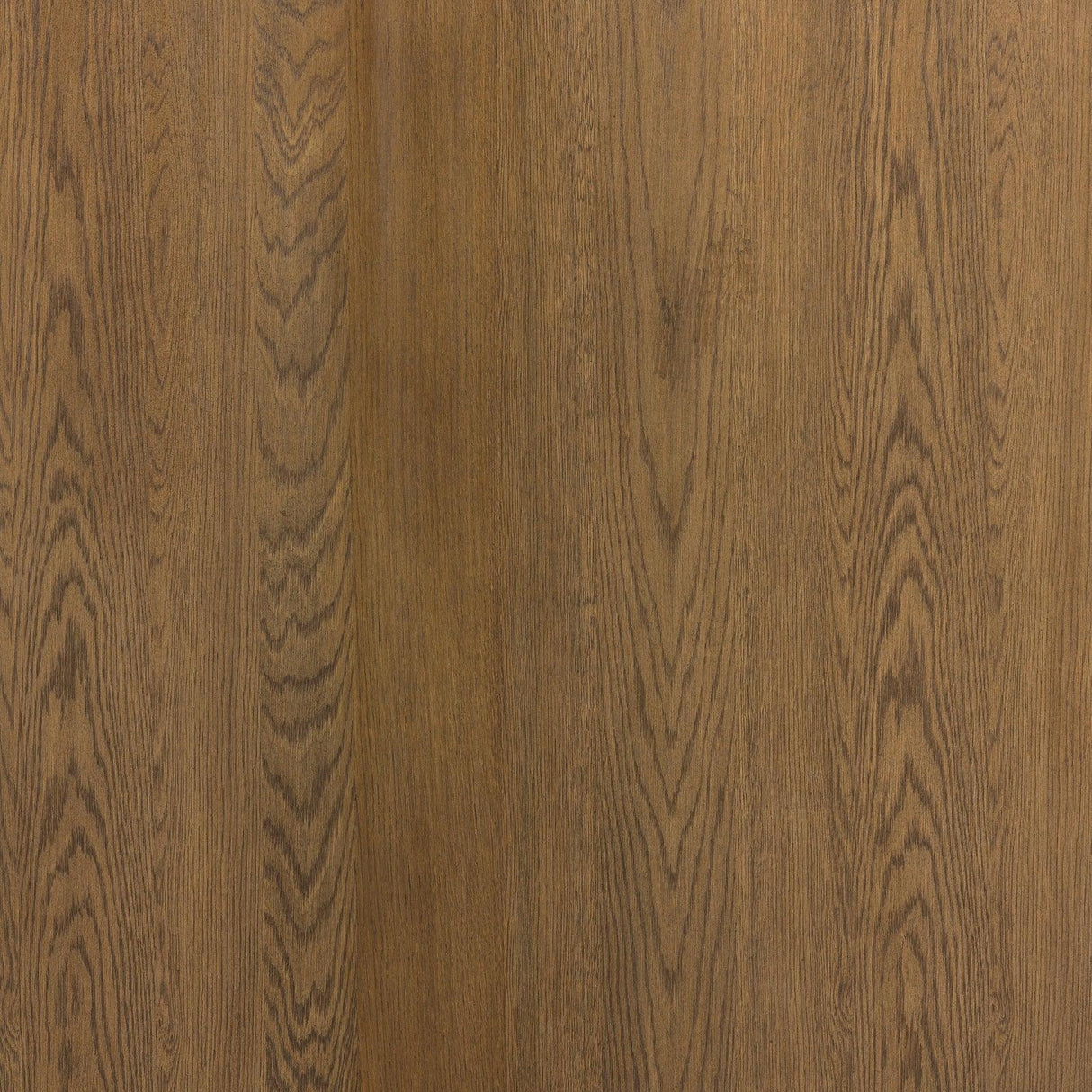 - Una base de roble macizo presenta paneles cuadrados para darle un toque geométrico, mientras que una cubierta de chapa de roble le da un toque monocromático.