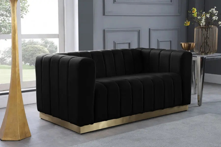 Sienta a tus invitados en la máxima expresión de comodidad y estilo con este loveseat de terciopelo Marlon. Esta pieza es perfecta para lucir un estilo moderno y garantizar el disfrute total de quienes tengan la suerte de relajarse en sus asientos capitoné. La suave tapicería de terciopelo negro añade un toque de belleza a tu espacio y se siente muy bien en la piel, mientras que la base de acero inoxidable dorado cepillado le da un acabado contemporáneo.