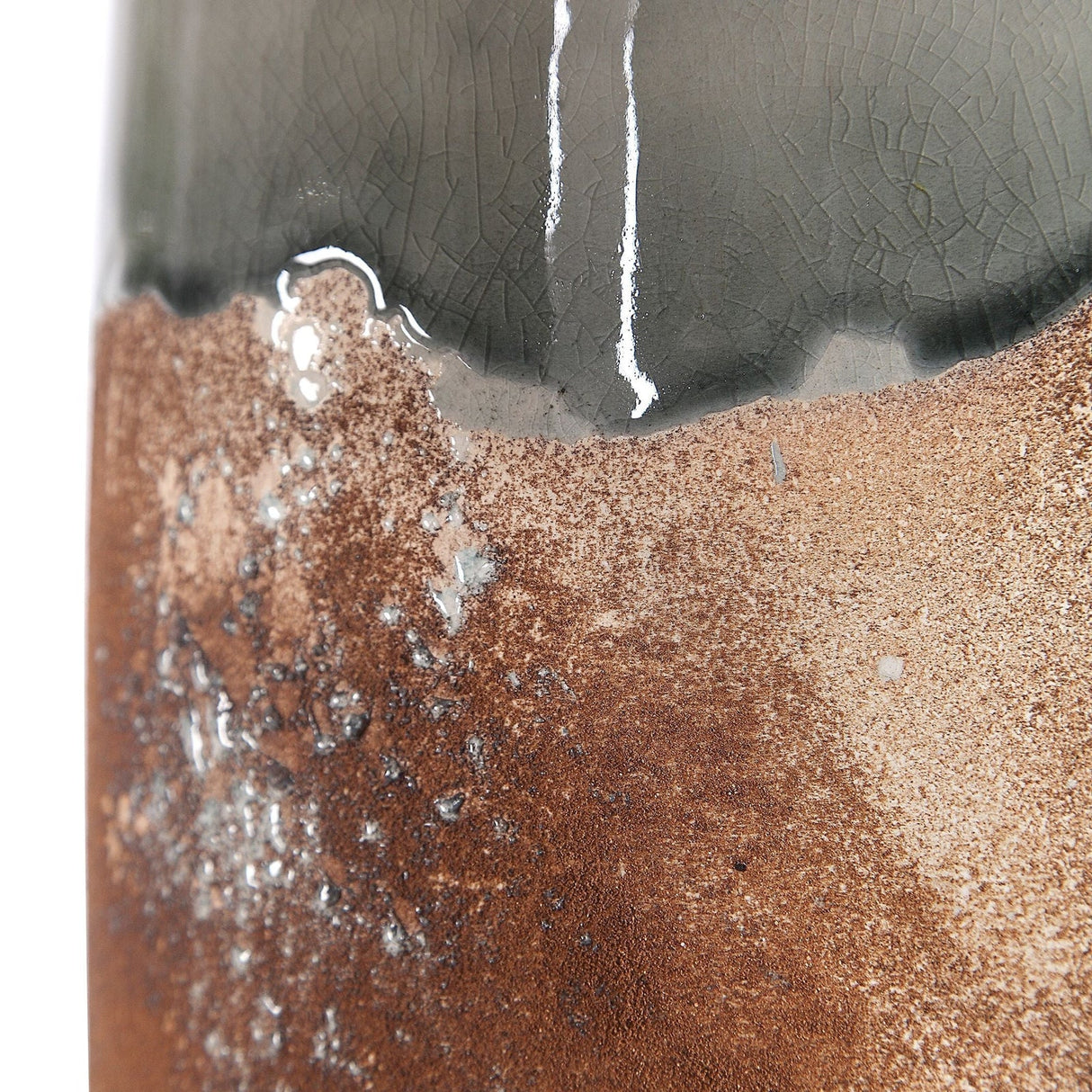 - Esta lámpara de mesa cuenta con una base de cerámica con acabado en un óxido de terracota terroso que se transforma en un esmalte verde grisáceo craquelado, acentuado con detalles niquelados cepillados y un pie de cristal grueso.