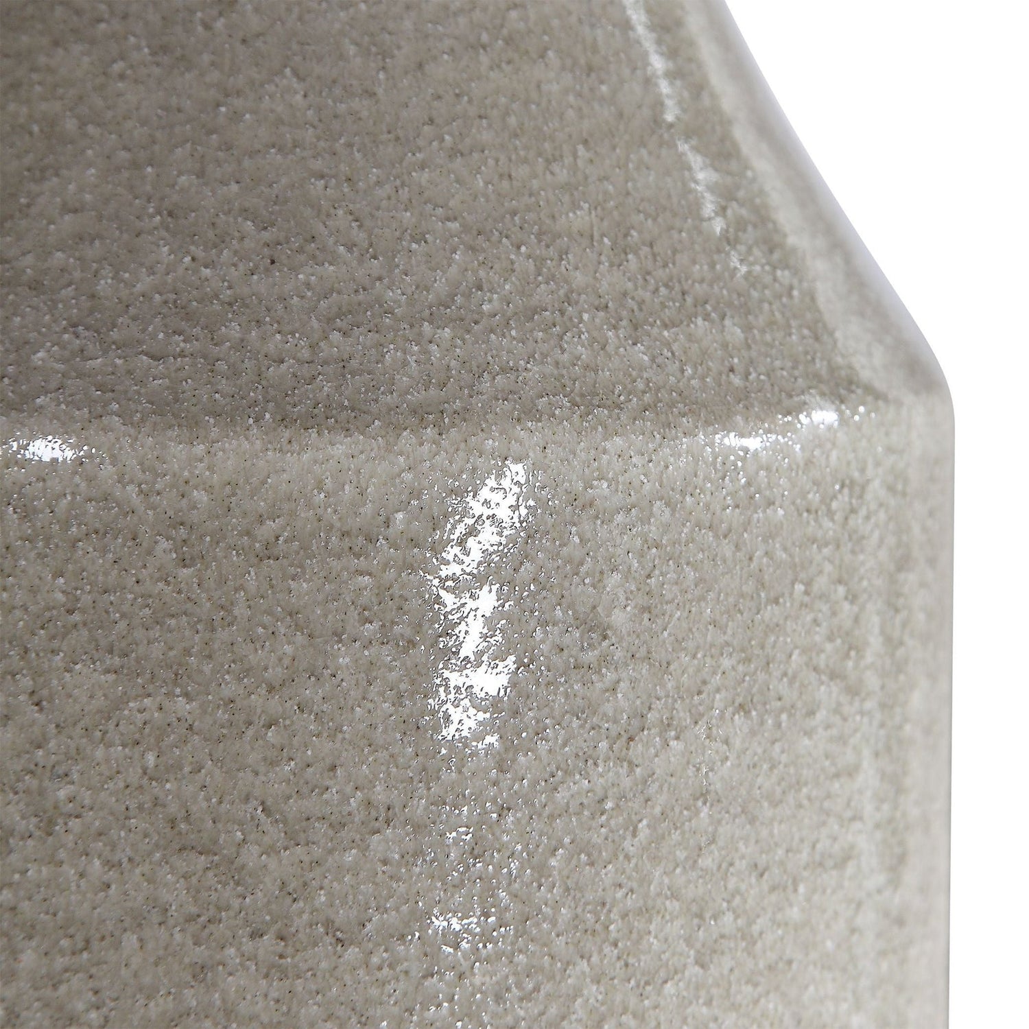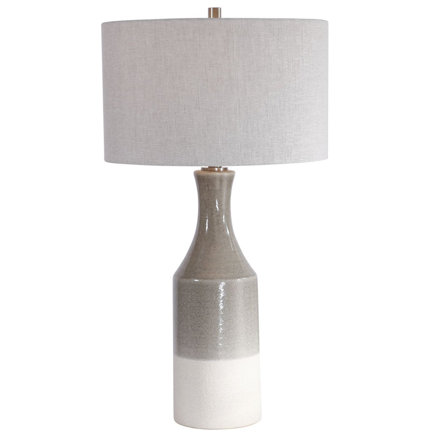 - Esta lámpara de mesa de cerámica exhibe un estilo bohemio y tiene un acabado esmaltado gris cálido brillante que se transforma en una base marfil muy texturizada.