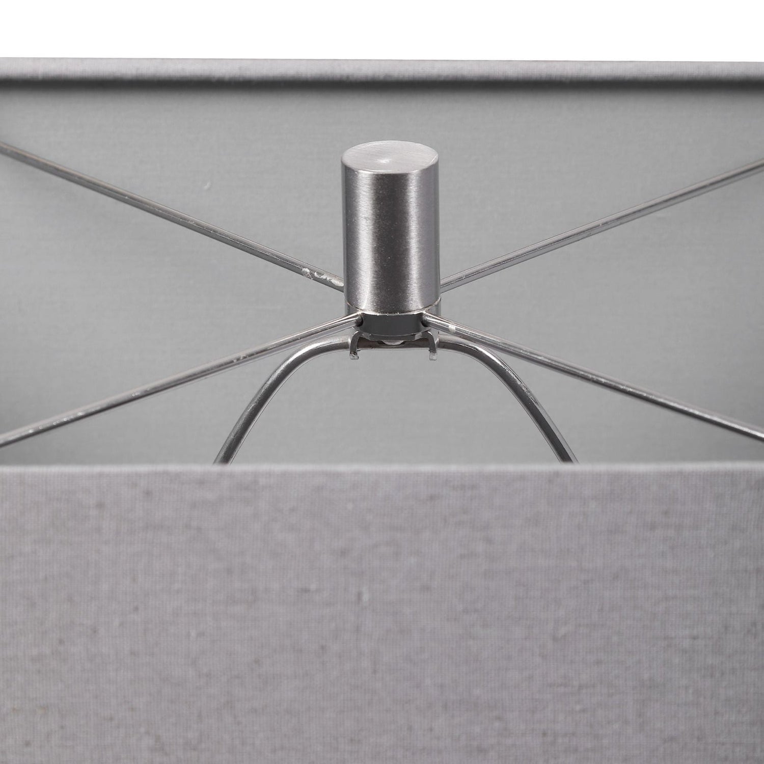 - La pieza está emparejada con una pantalla rectangular de tapa dura en tela de lino gris con ribete natural.