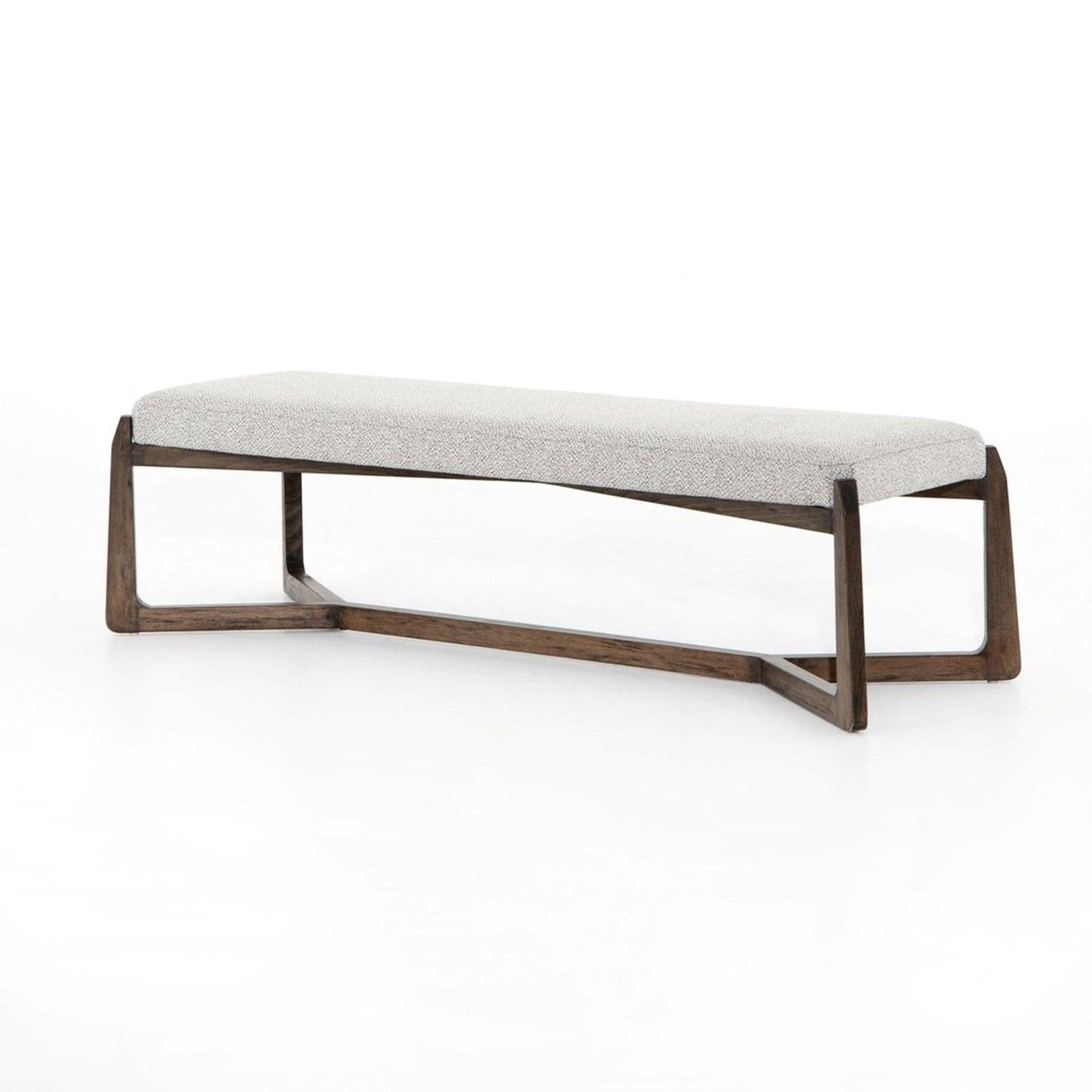 - Ideal en una entrada, un comedor o al pie de la cama, un marco aireado de madera de haya con base cruzada sostiene un asiento texturizado estilo banco, tapizado en una tela de alto rendimiento exclusiva de Four Hands.