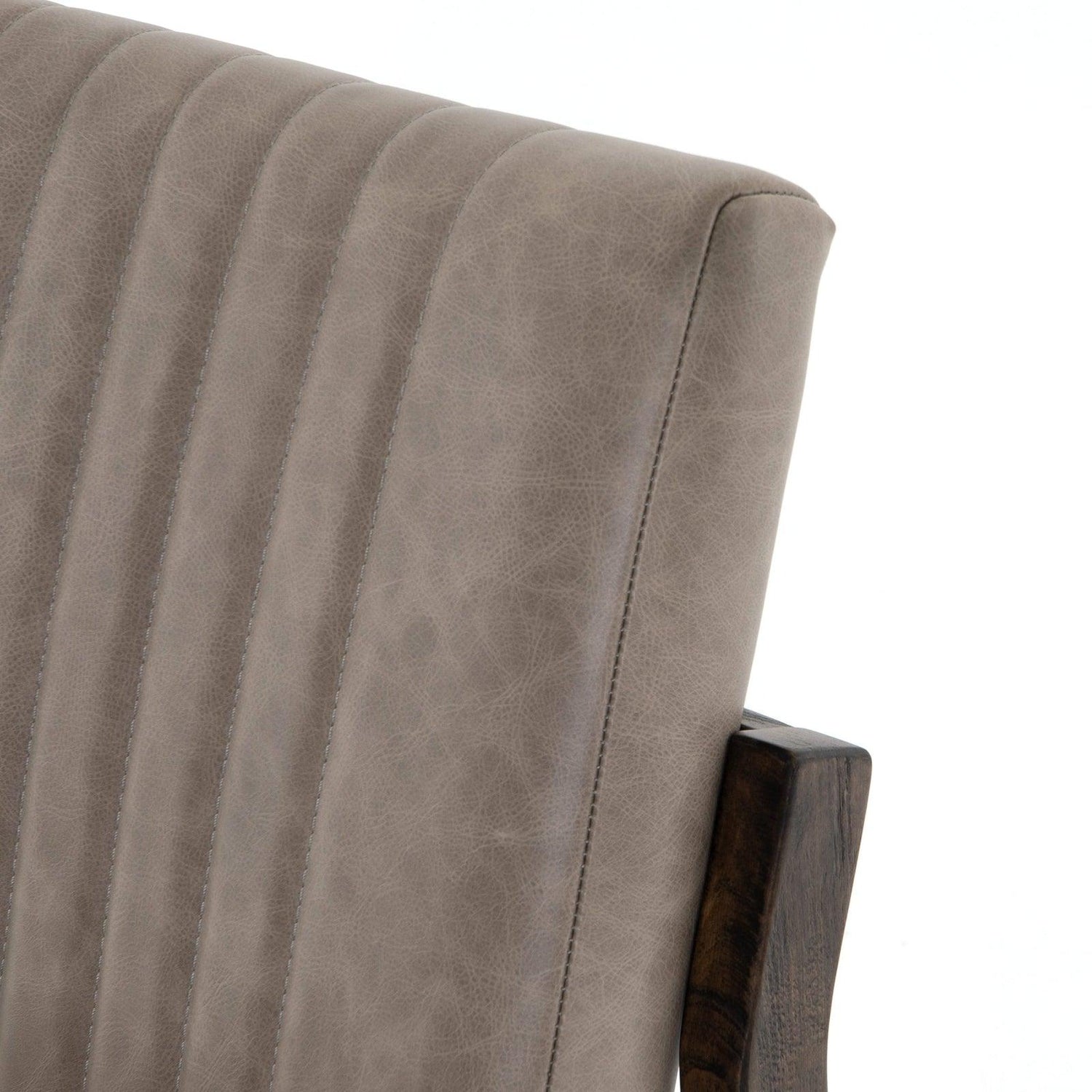 - Los canales verticales y el cuero de grano superior de color castaño y gris exclusivos de Four Hands le otorgan a esta silla de comedor inspirada en los años 50 una nueva energía.