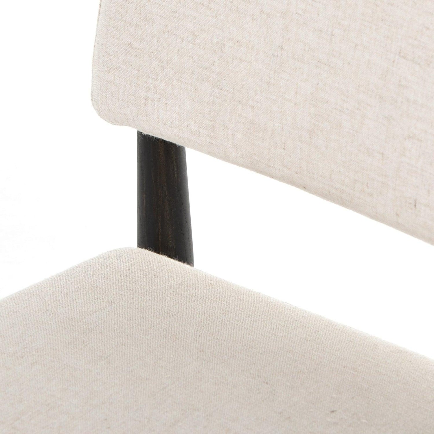 - Con tapas bañadas en hierro, patas cónicas con acabado en negro, marco de roble macizo y asientos de color blanco roto, tapizados con cuidado con tela de alto rendimiento.