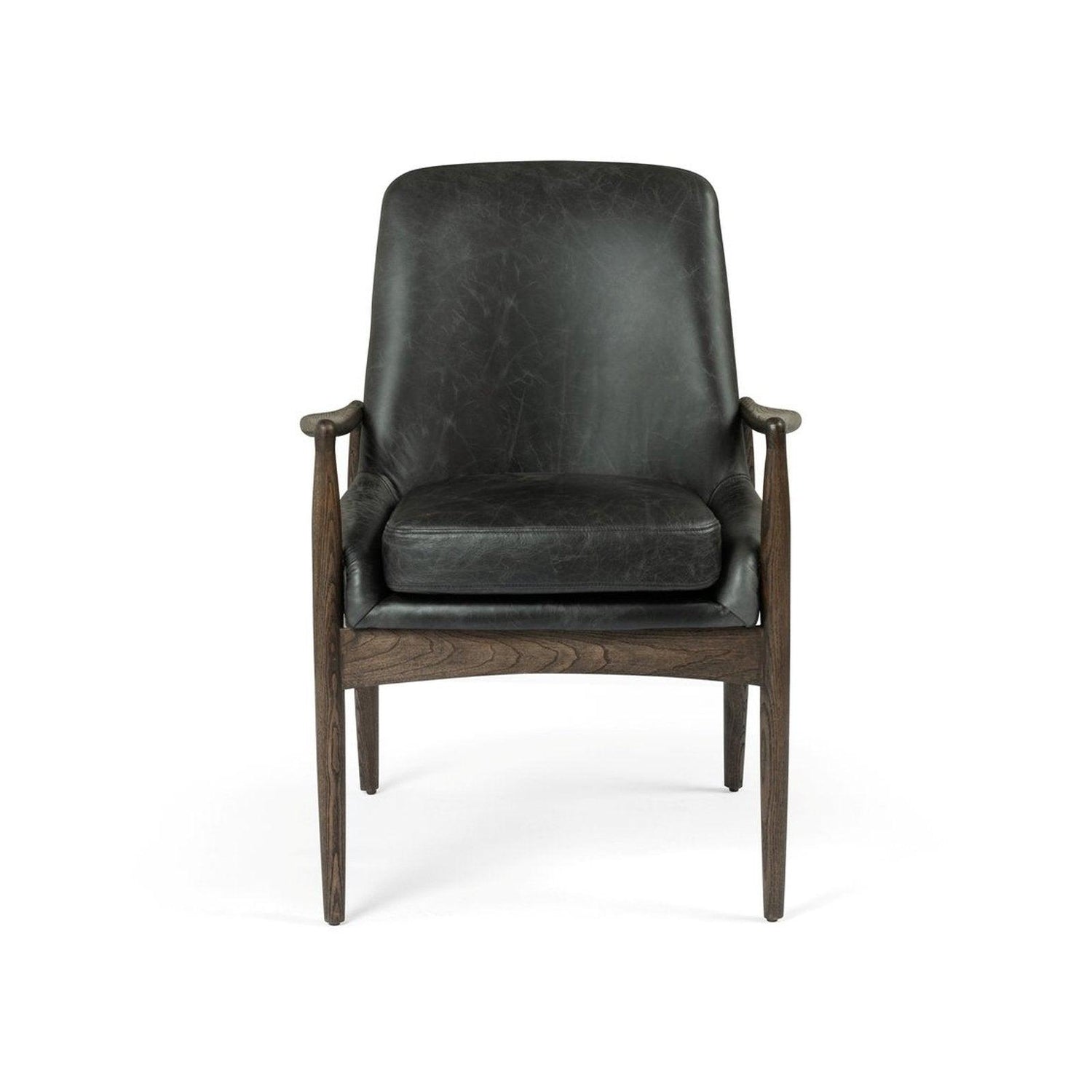 - Un marco sorprendentemente detallado agrega una sensación arquitectónica a un sillón tapizado de cuero de grano superior con una forma precisa.