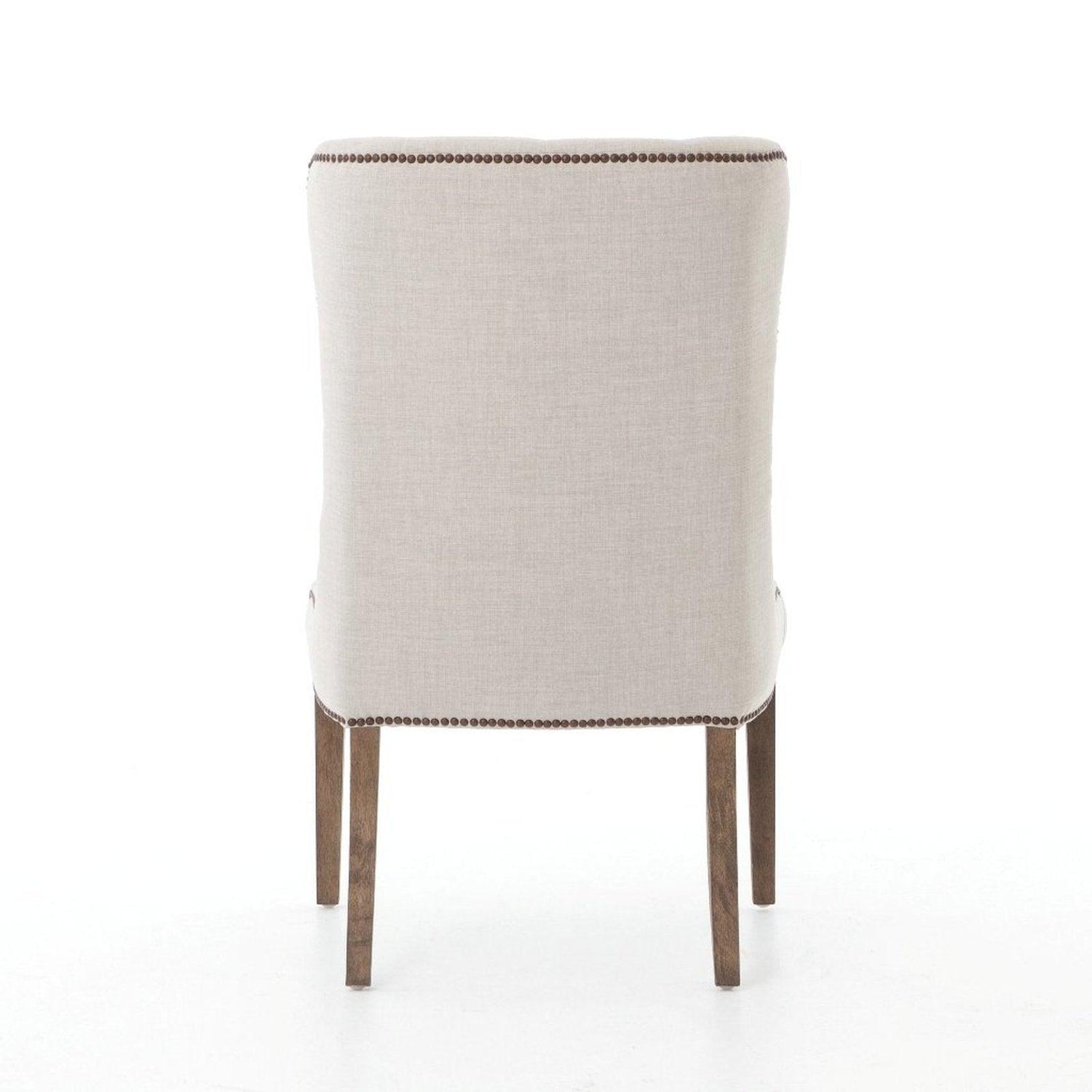 - La tapicería en tonos naturales se ve acentuada por capitoné poco profundo, tachuelas de latón envejecido y patas de madera desgastada.