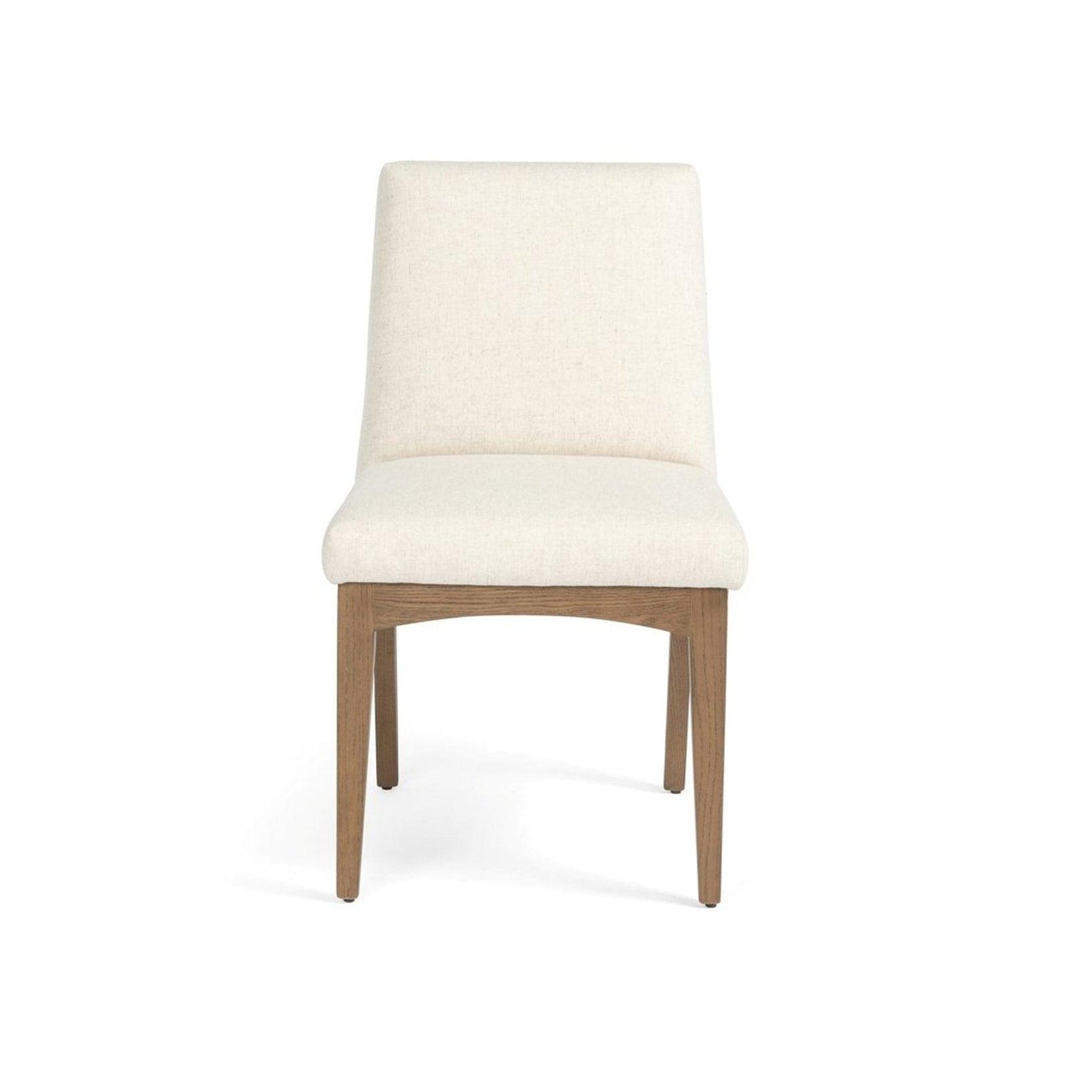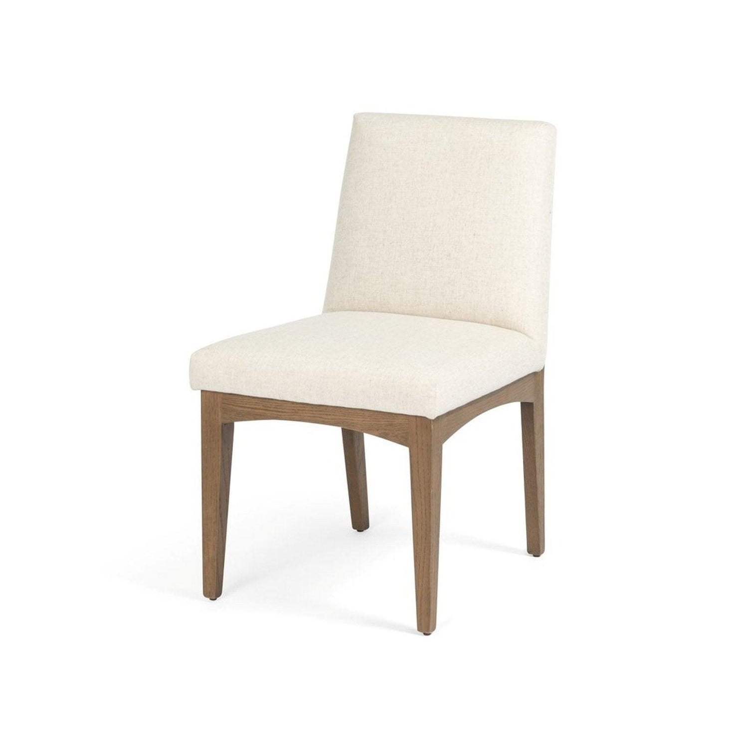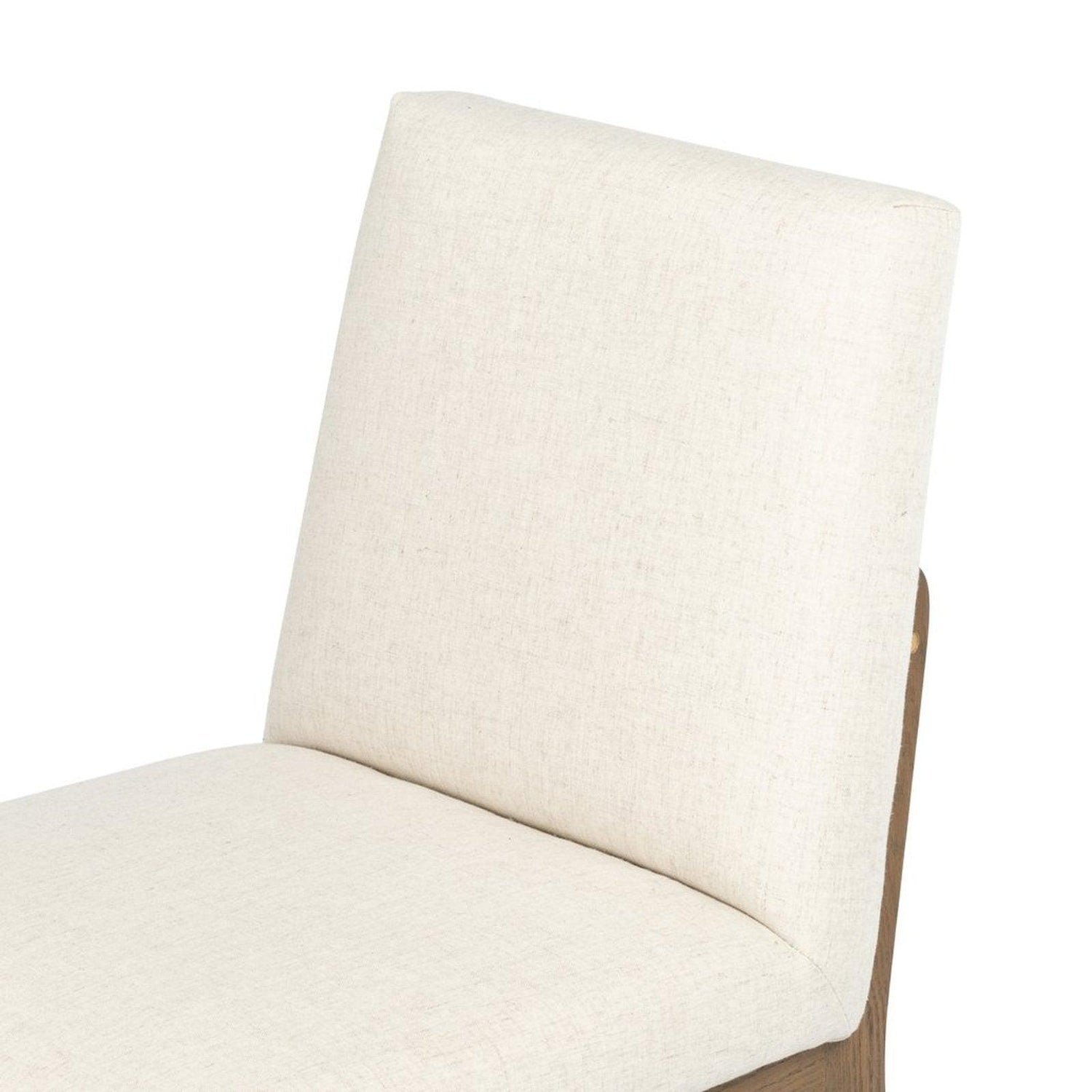 - Marcos de roble color miel sin brazos, asientos tapizados de alto rendimiento en un blanco roto neutro y atractivo.