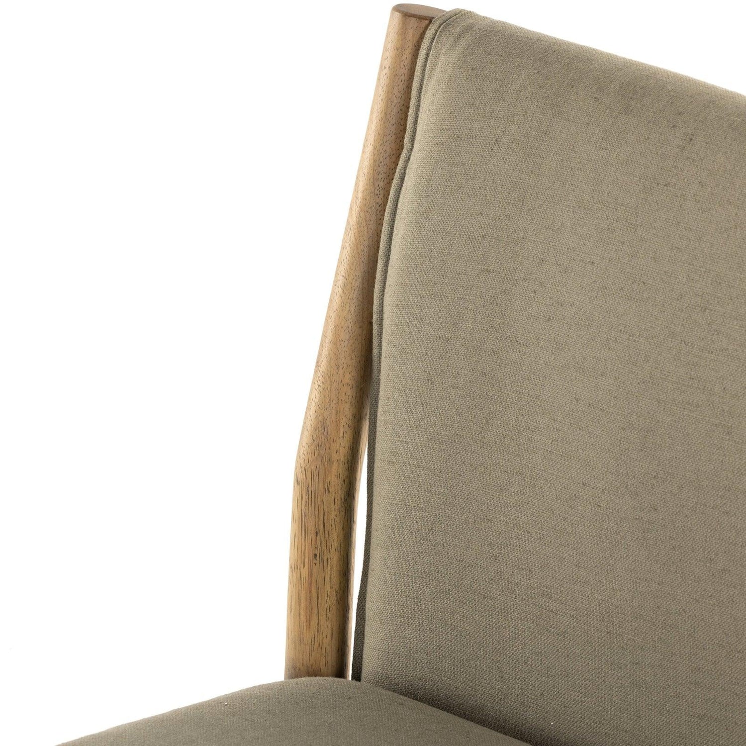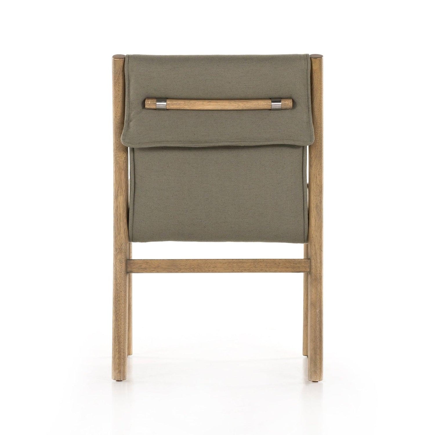 - Una tela de alto rendimiento de color topo/oliva se pliega sobre un marco de madera de parawood maciza para darle un toque texturizado a las cenas de todos los días.