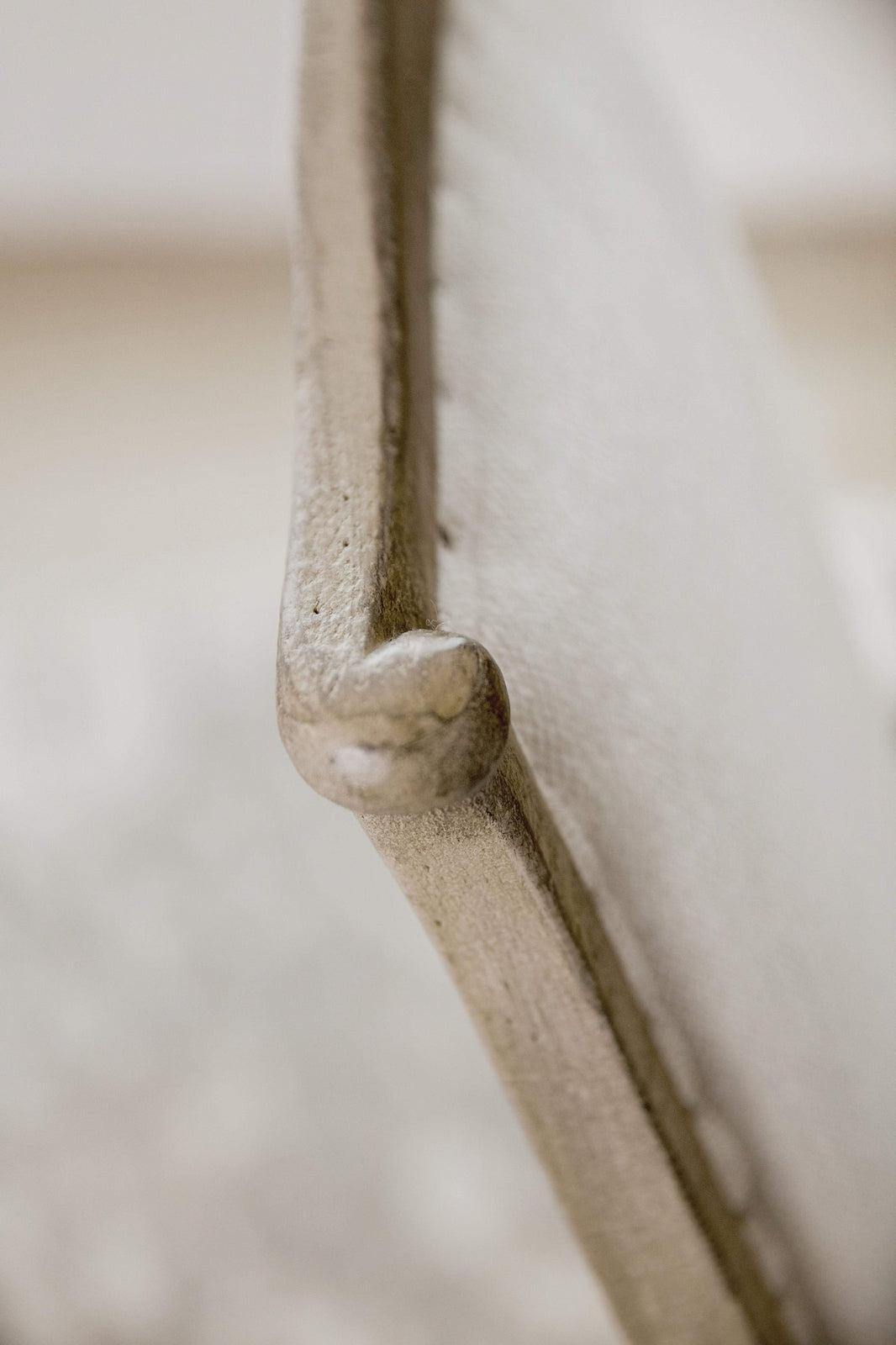 - Desde la delicada base curvada e entrecruzada hasta el intrincado borde de clavos que delinea el asiento y el respaldo de color blanco grisáceo suave y la base festoneada del asiento, esta versátil silla es atemporal y acogedora.
