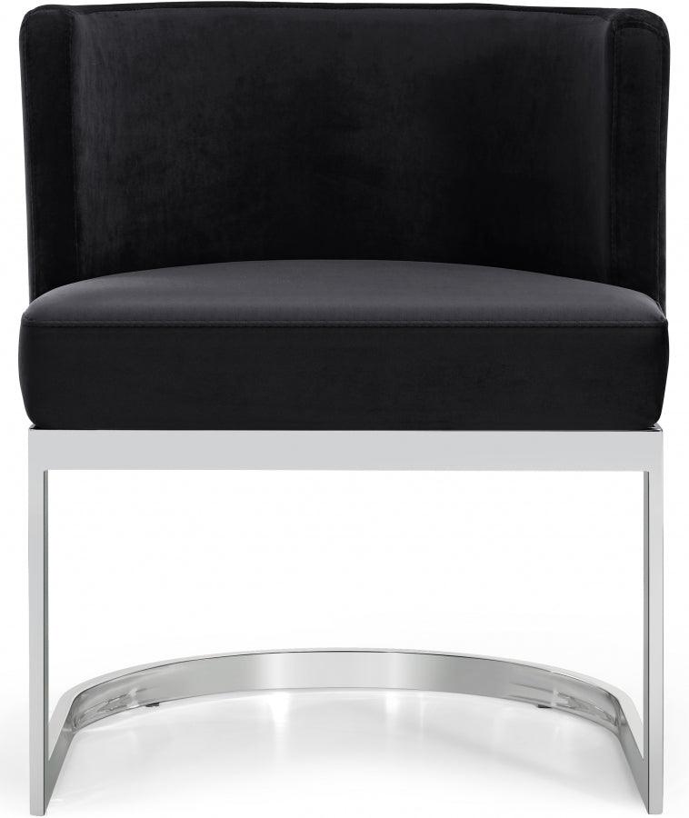 Dale a tu comedor un toque retro con la silla de comedor Gianna de terciopelo negro de Meridian Furniture. Su respaldo con diseño de barril te ofrece comodidad mientras disfrutas de una comida con amigos. Su grueso acolchado y tapizado en lujoso terciopelo gris le dan un toque de lujo. La base es de acero inoxidable con acabado cromado, lo que le da un acabado deslumbrante.