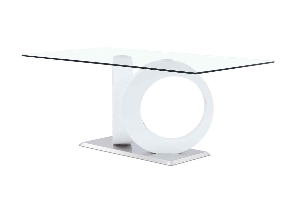 Con su diseño artístico y estilo geométrico, esta elegante mesa de comedor es justo lo que necesita su comedor. Cuenta con patas esculturales en acabado blanco, tablero rectangular de vidrio templado y base cromada para completar su estilo.
