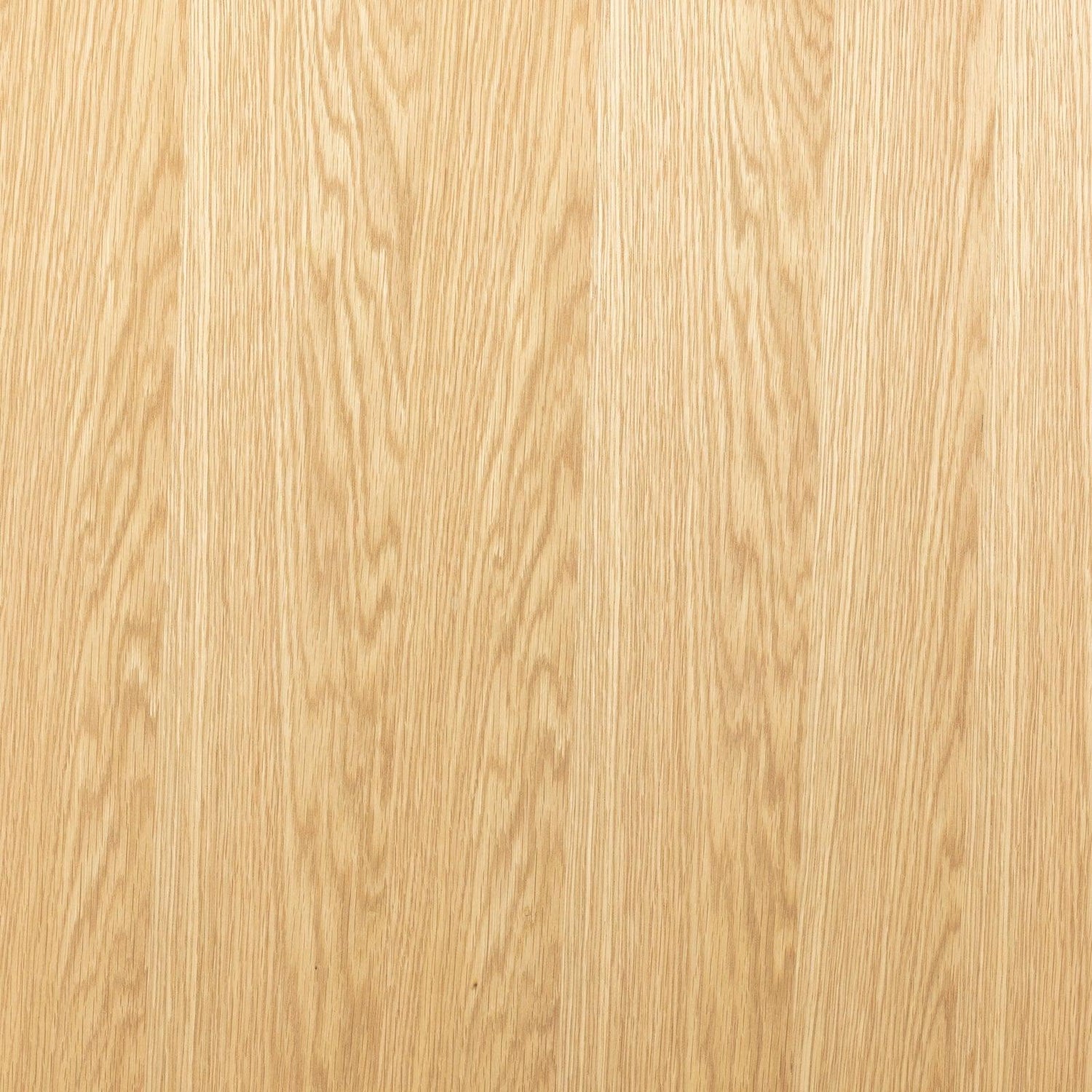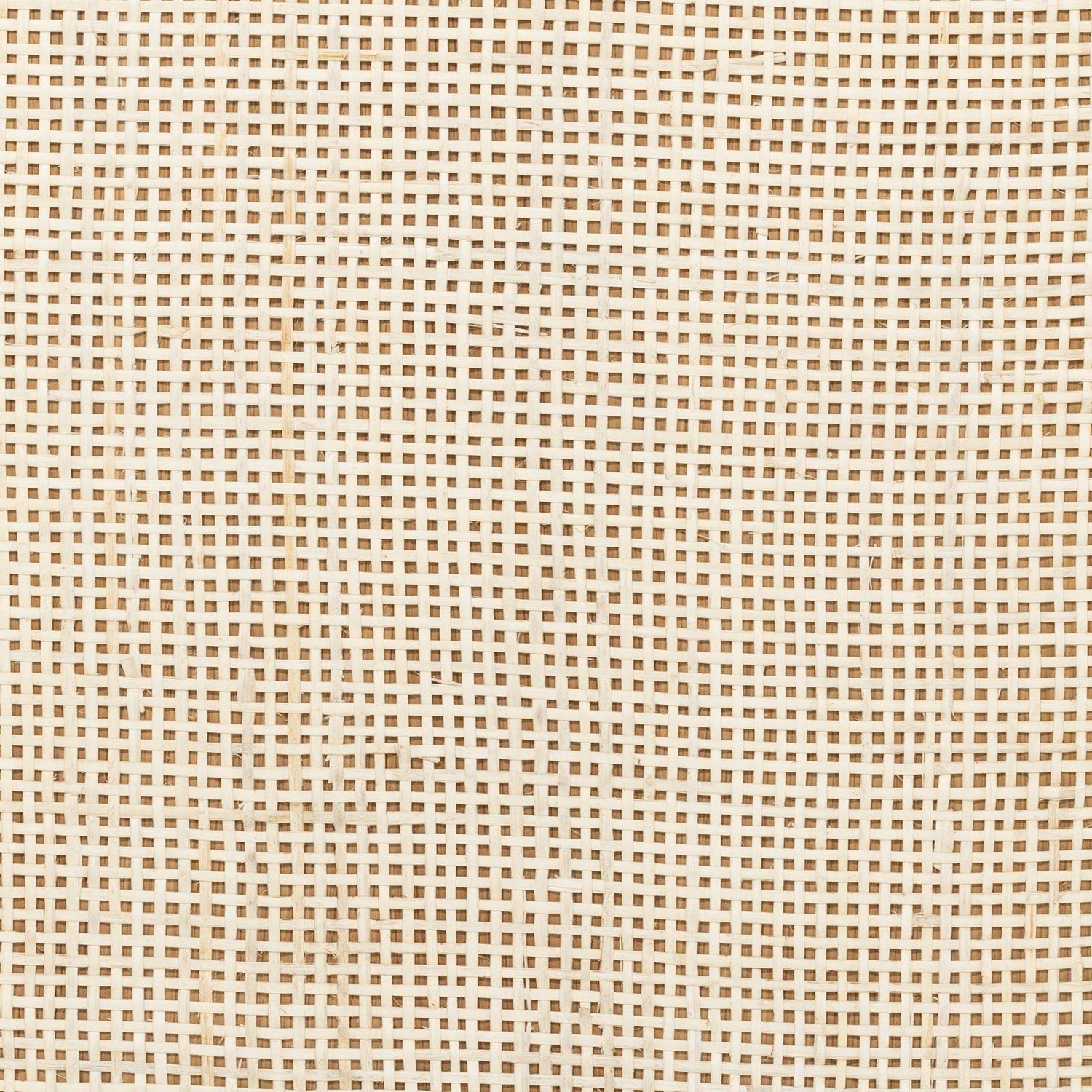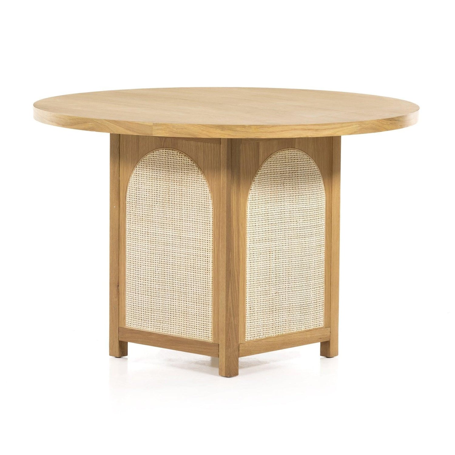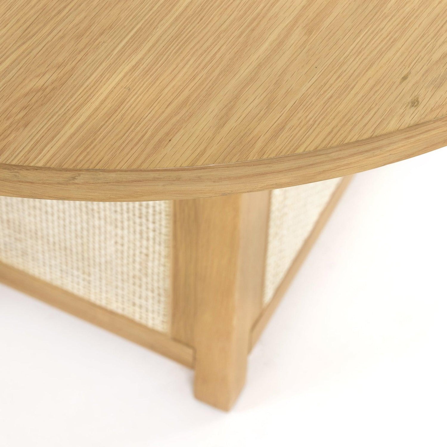 - El roble con acabado miel forma una mesa redondeada y una base estructurada que presenta paneles de caña bellamente arqueados con respaldo de madera para un toque texturizado.