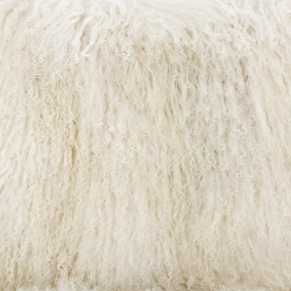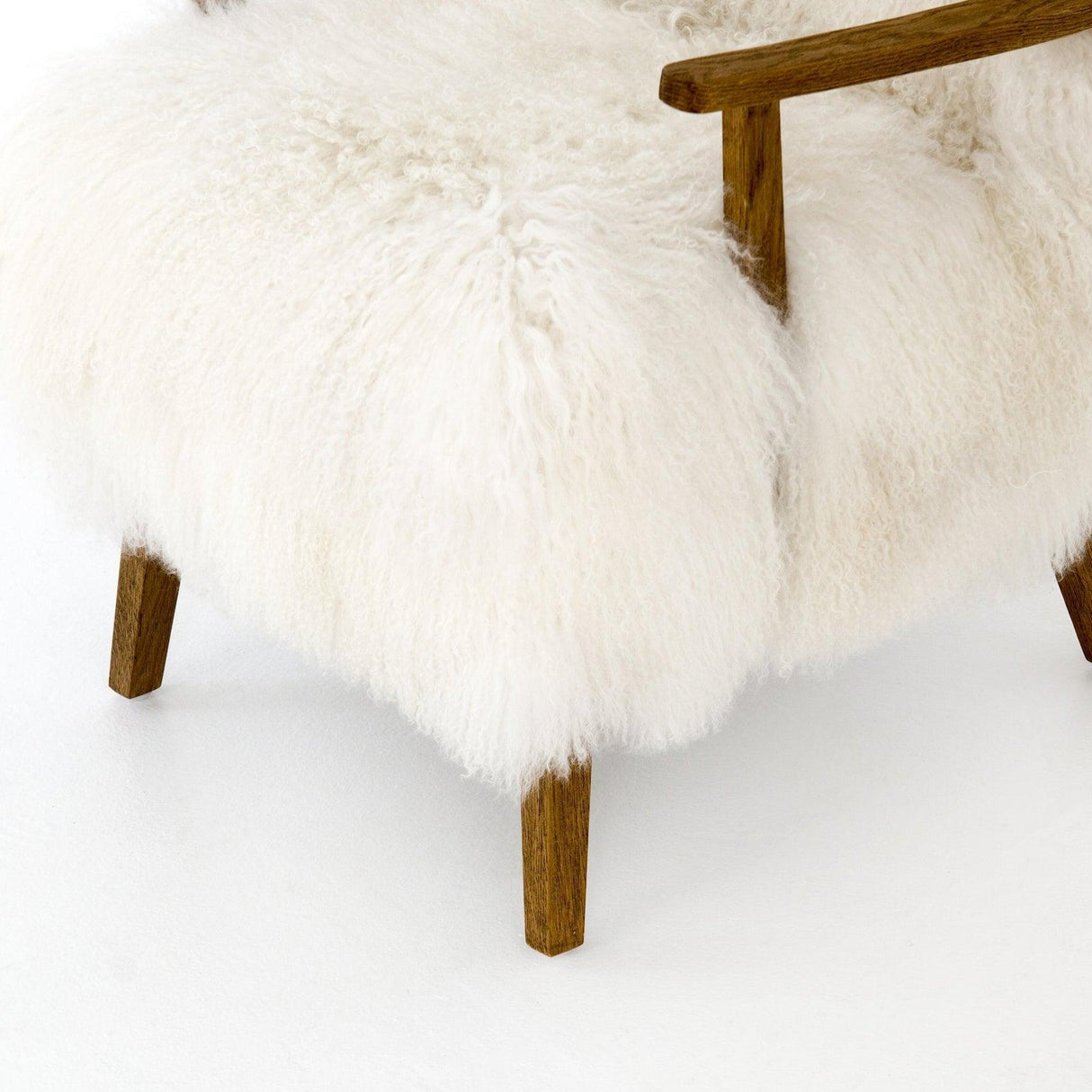 - Los brazos esculpidos de roble a la deriva emergen de asientos peludos de piel de Mongolia de color crema.