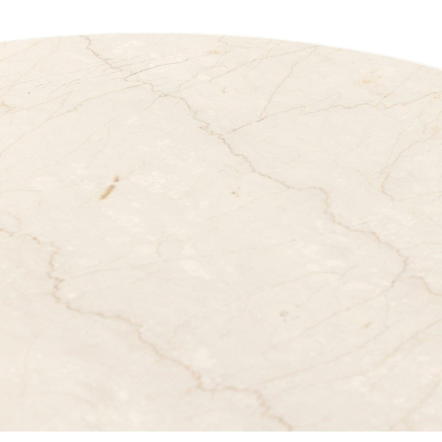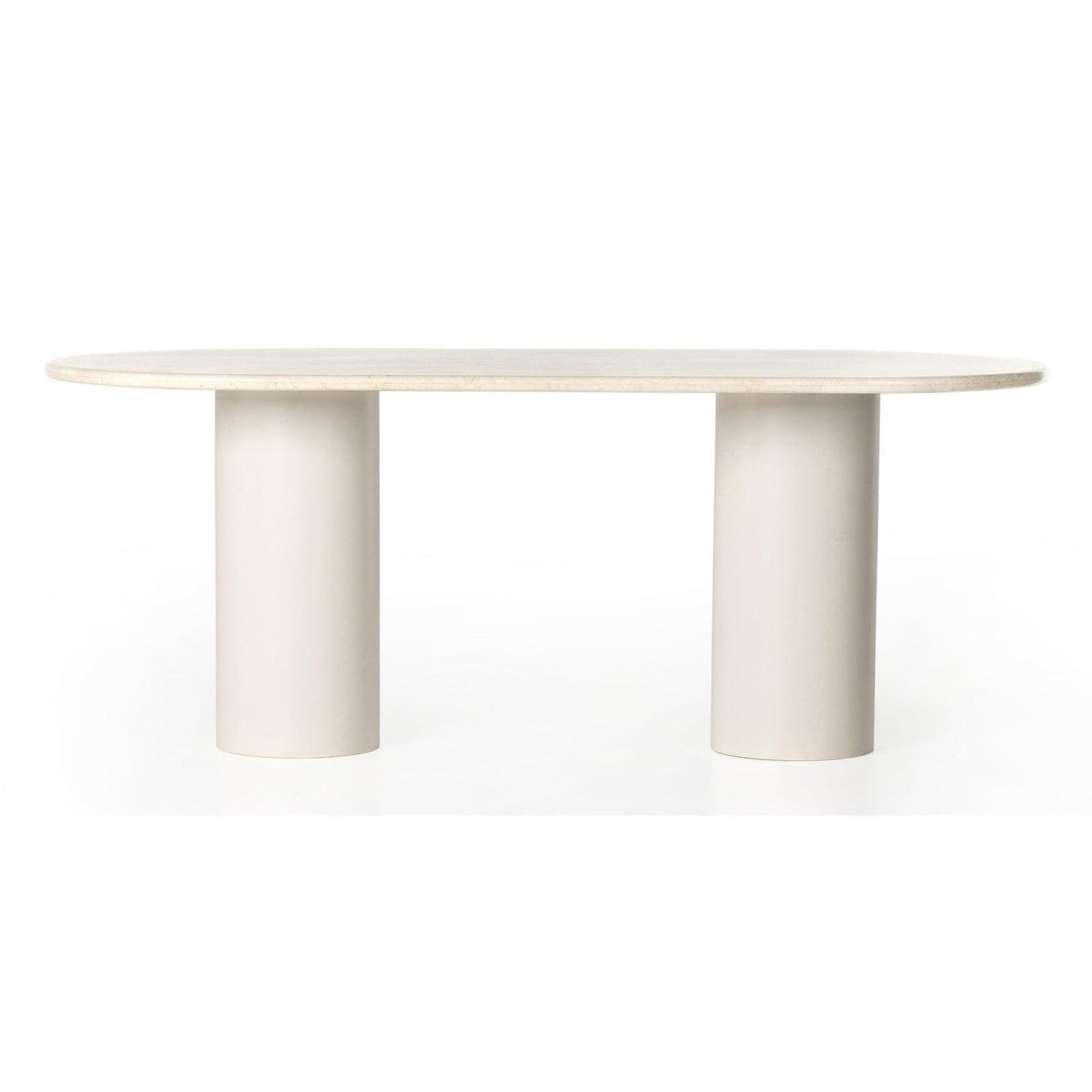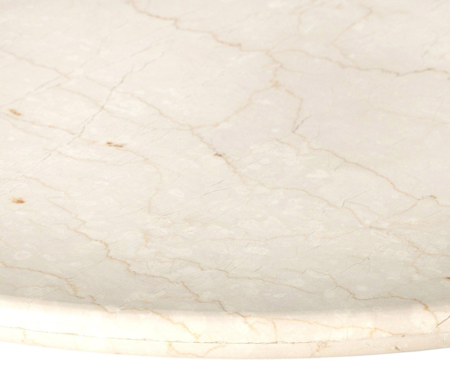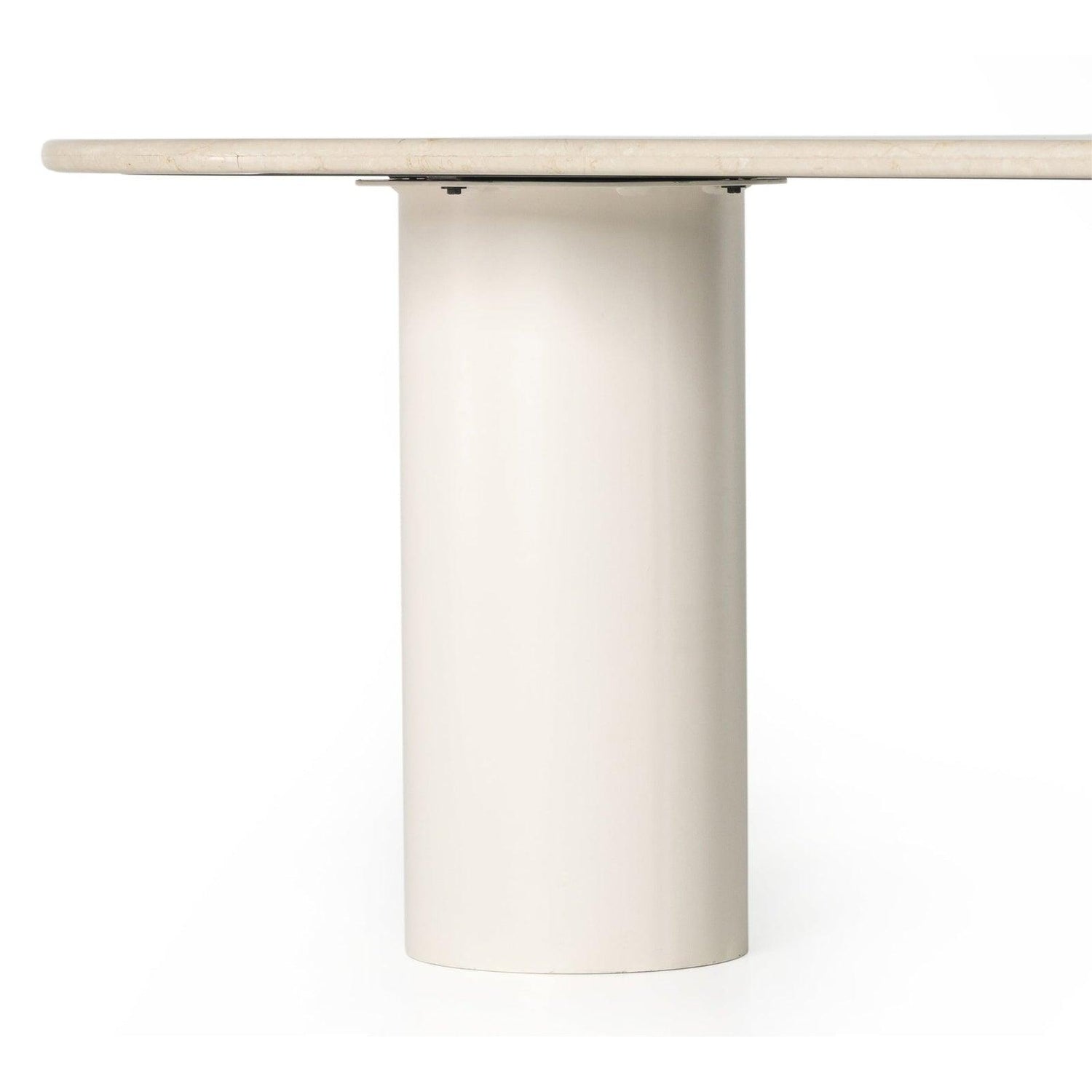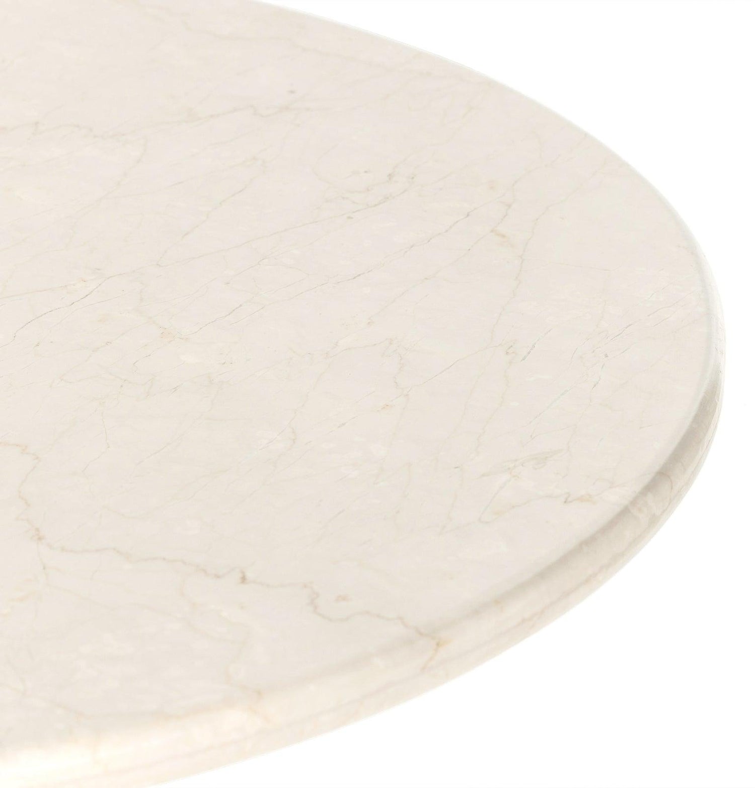 - Una espaciosa mesa de forma ovalada inspirada en el diseño italiano de los años 70, una base de hierro con acabado marfil sostiene una mesa redondeada de mármol sólido color crema, para una apariencia fresca y monocromática que combina con casi cualquier cosa.