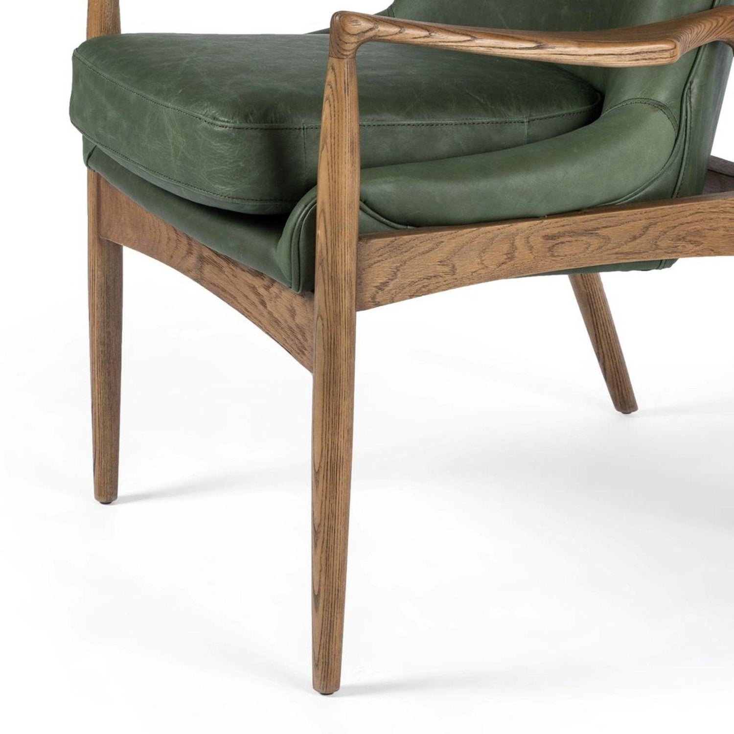 - Un marco sorprendentemente detallado agrega una sensación arquitectónica a un sillón tapizado de cuero de grano superior con una forma precisa.