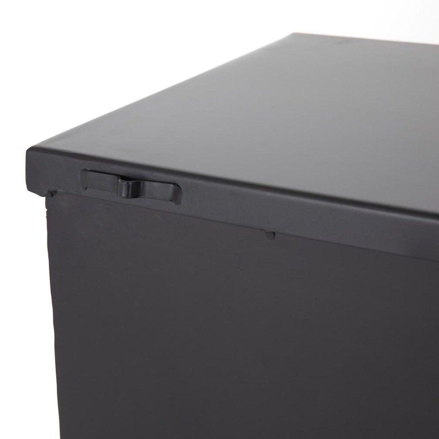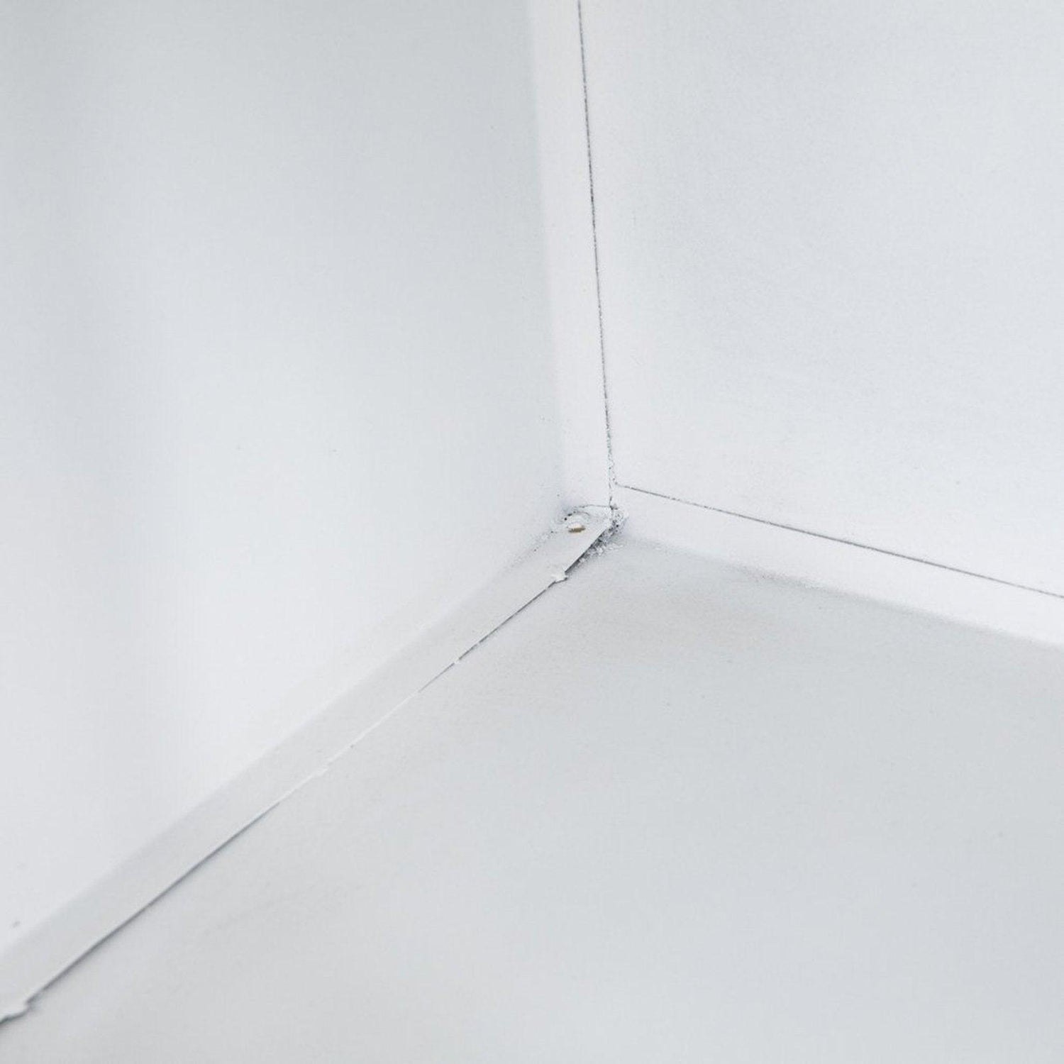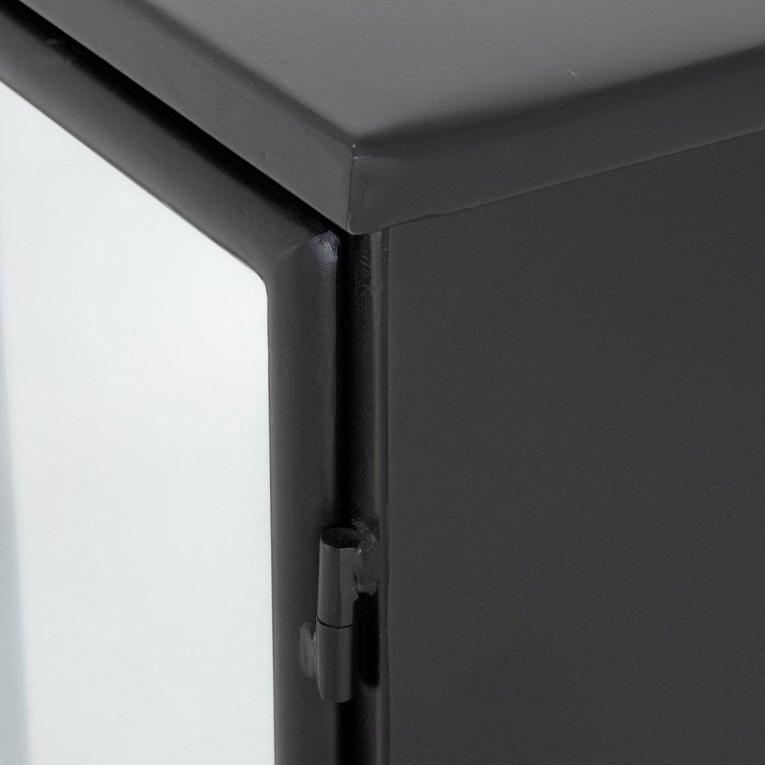 - Un marco de hierro negro desgastado contrasta con un interior blanco limpio para darle una versión actualizada de la consola multimedia tradicional.