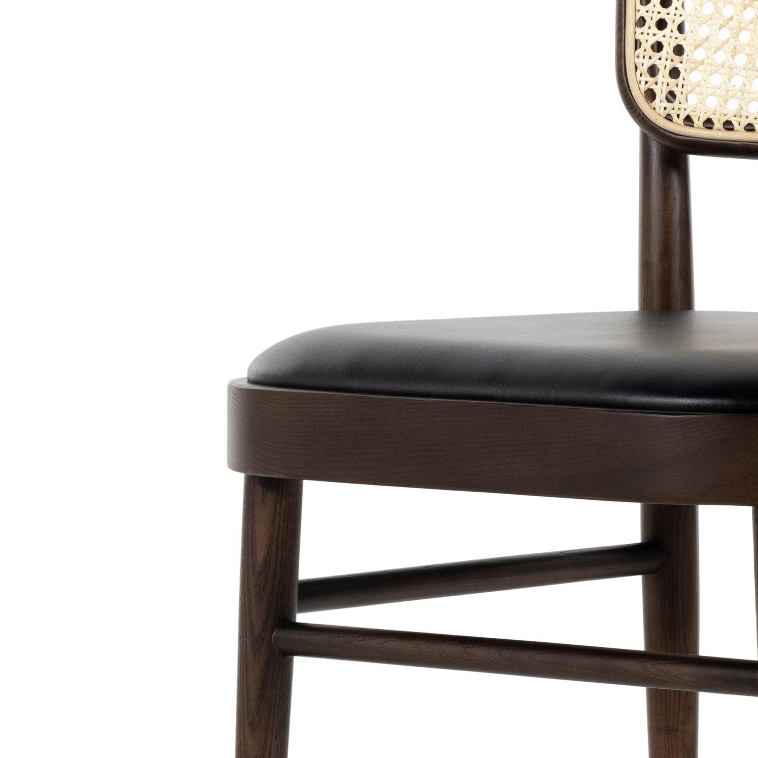 - Inspirada en la silla Thonet popularizada a mediados de siglo, el fresno oscuro y sólido forma un marco simple pero bien formado para un asiento de espuma de poliuretano negra y un respaldo de caña natural.