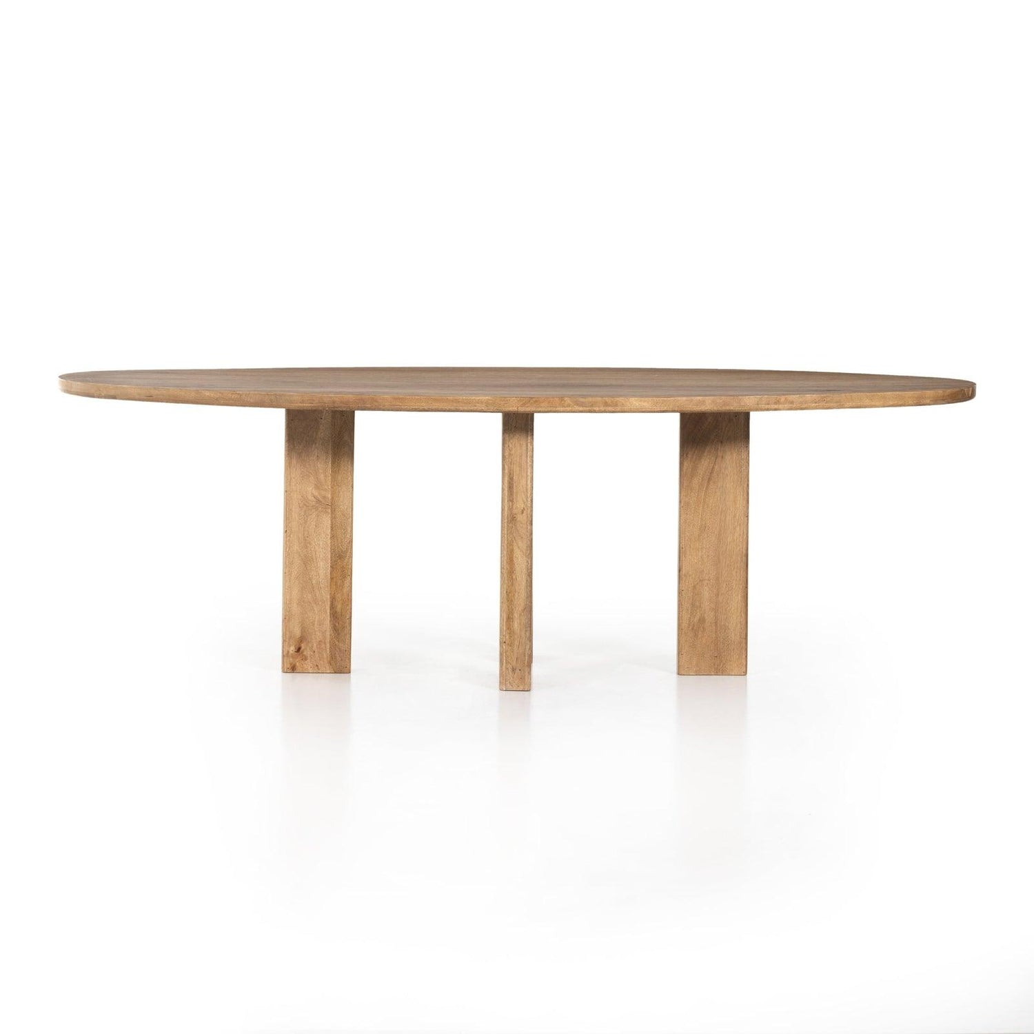 - Fabricada en mango macizo lavado claro, una mesa de comedor estilo elipse presenta patas en dirección invertida para una apariencia única y escultural.
