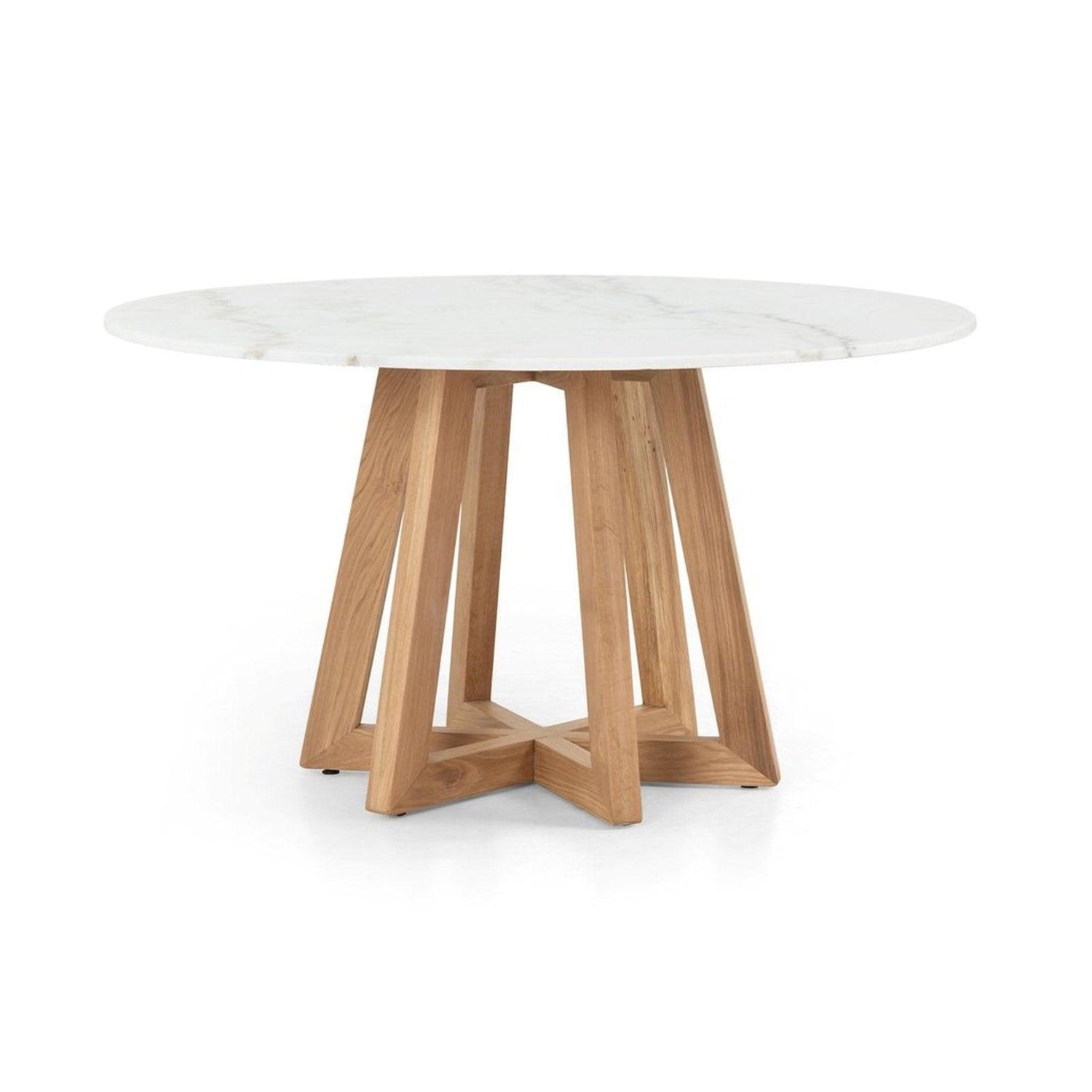 - Una base angular abierta de roble con acabado color miel claro sostiene una mesa redondeada de mármol blanco, para una apariencia limpia y versátil, ideal para las cenas de todos los días.