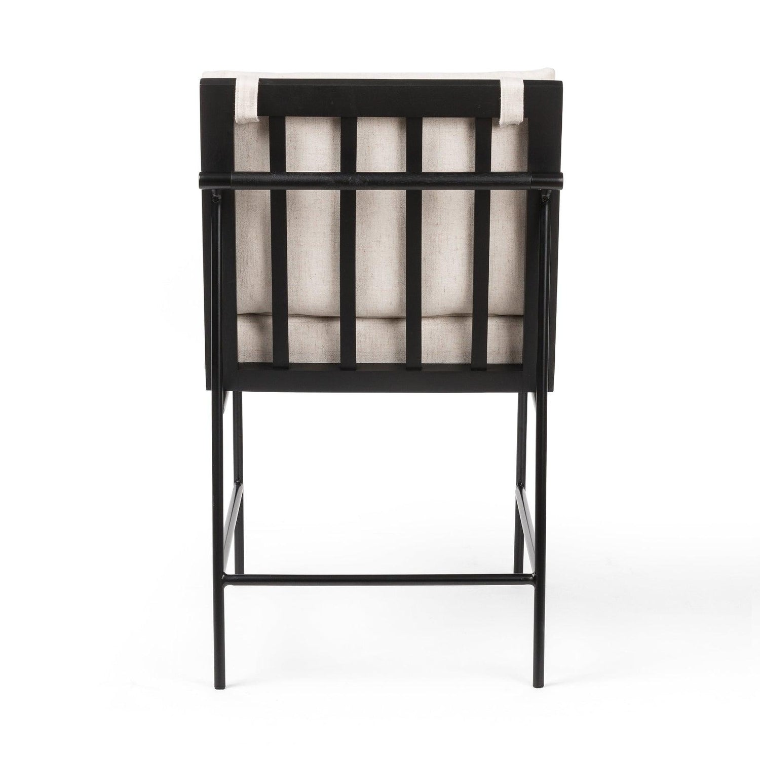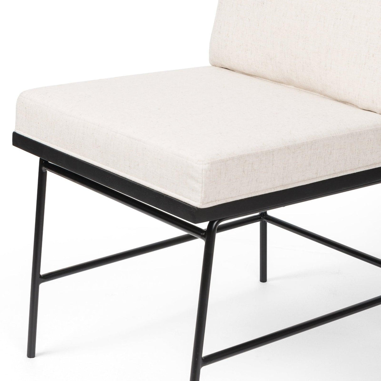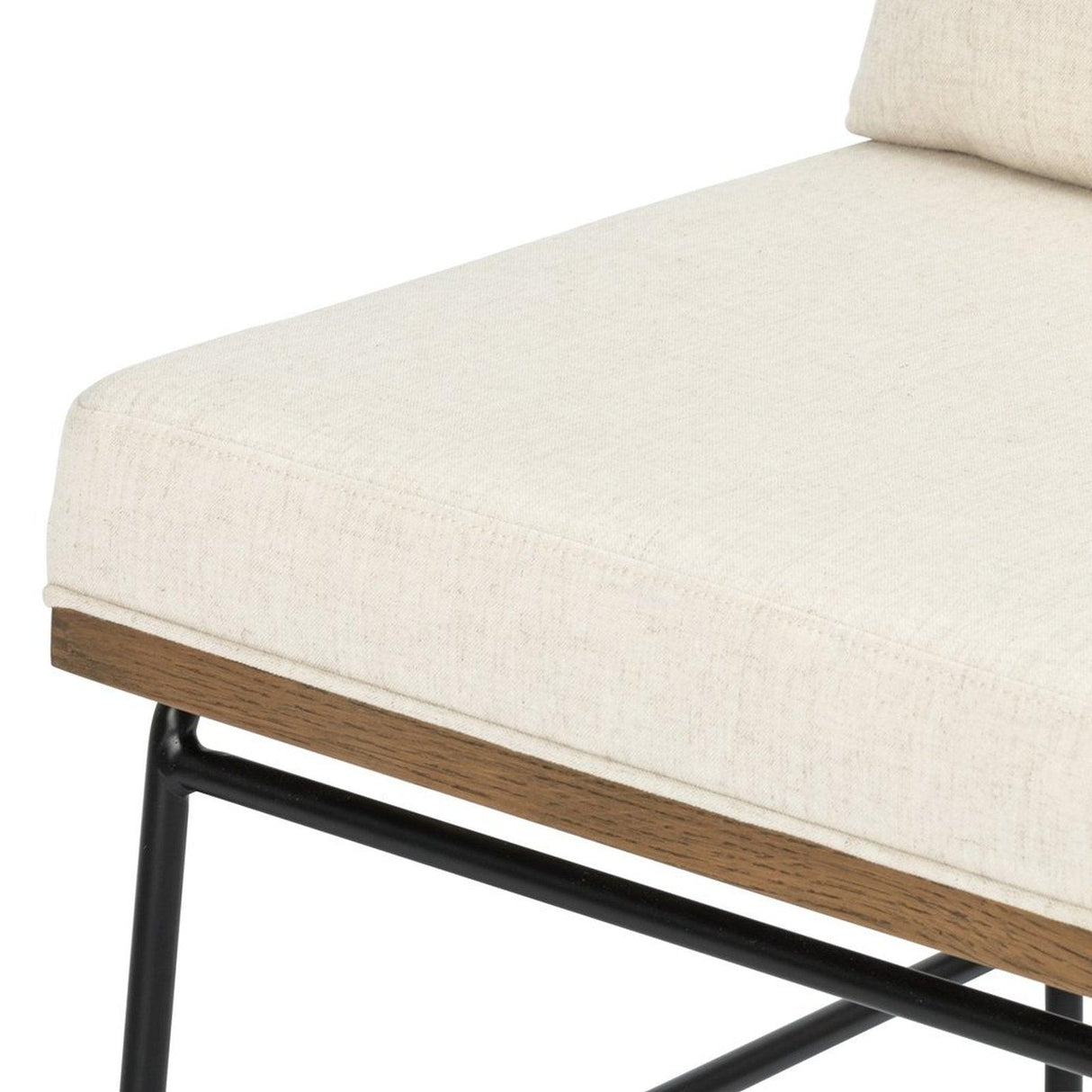 - Un delgado marco de hierro con acabado en negro enmarca un respaldo flotante de roble con acabado en miel y asientos de mezcla de lino color crema.