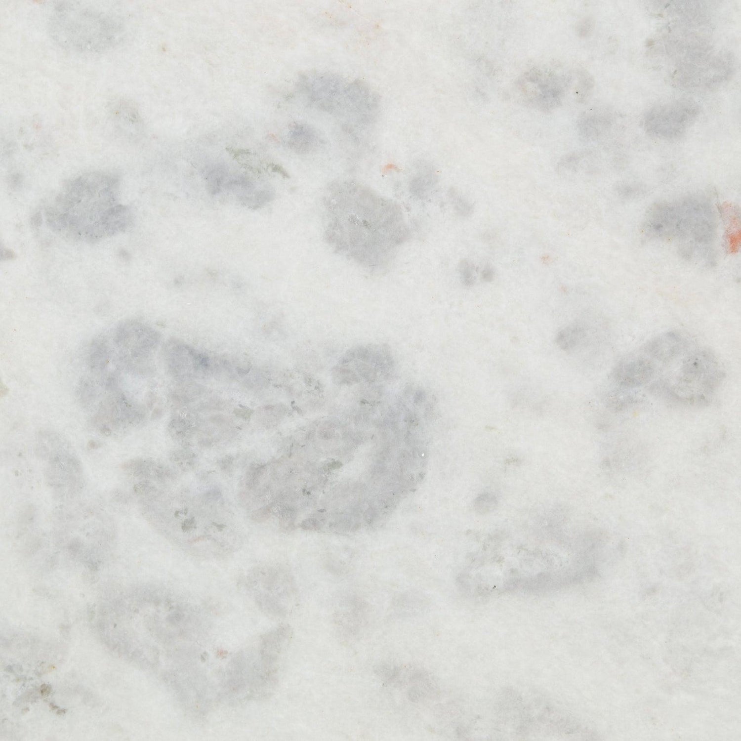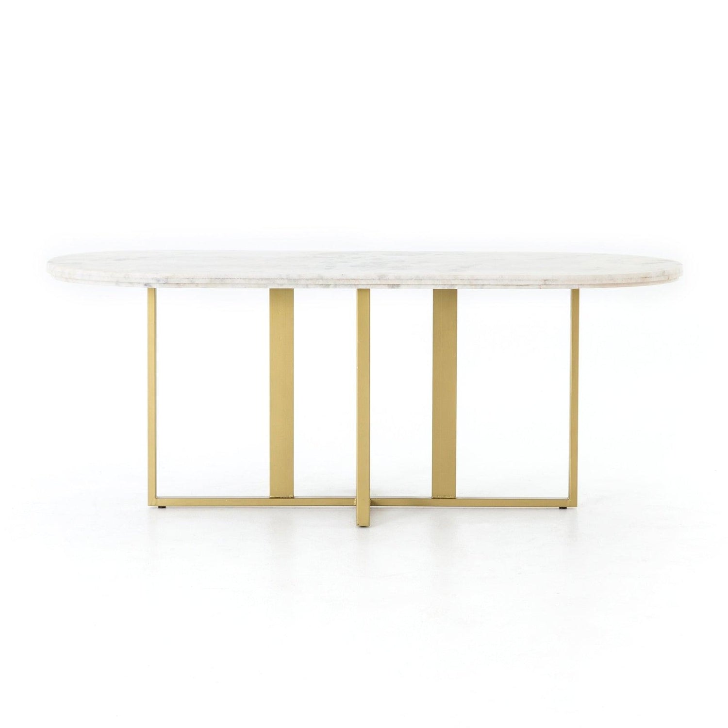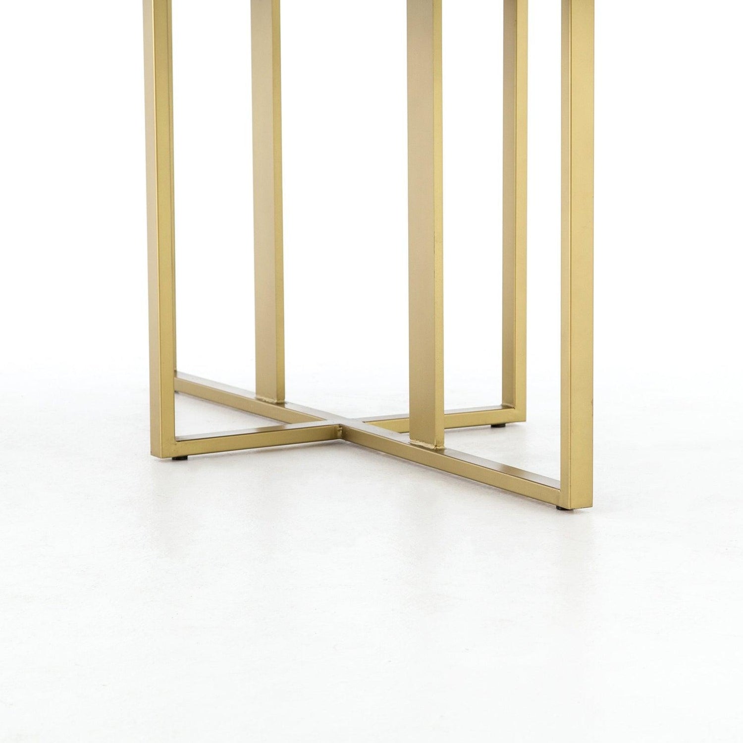 - Una base de hierro con acabado de latón forma ángulos arquitectónicos limpios para sostener una parte superior redondeada de mármol blanco.
