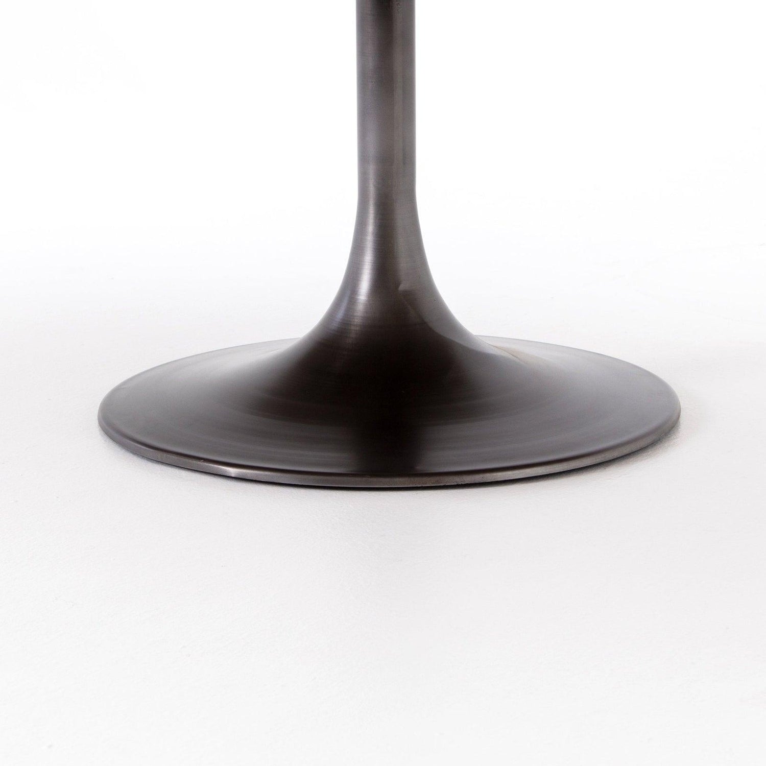 - La clásica forma de tulipán se reformula con una base de hierro gris vasija y una tapa ovalada de roble claro quemado con bandas de acero de latón pulido con cabezas de clavos expuestas.