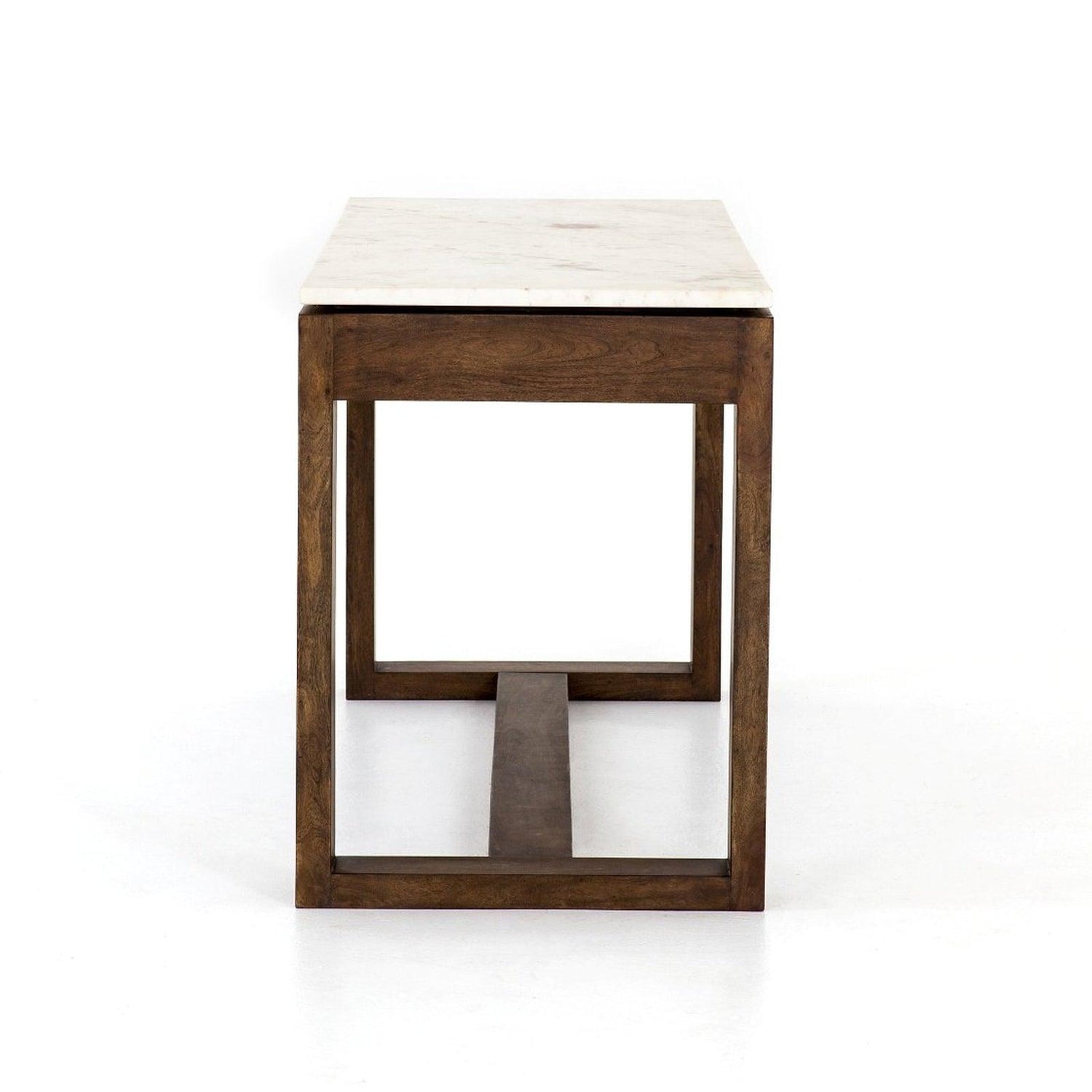 - La acacia maciza con acabado marrón da la bienvenida a seis cajones en total, tres en cada lado, con una superficie de mármol blanco pulido que mantiene las cosas suaves y sofisticadas.
