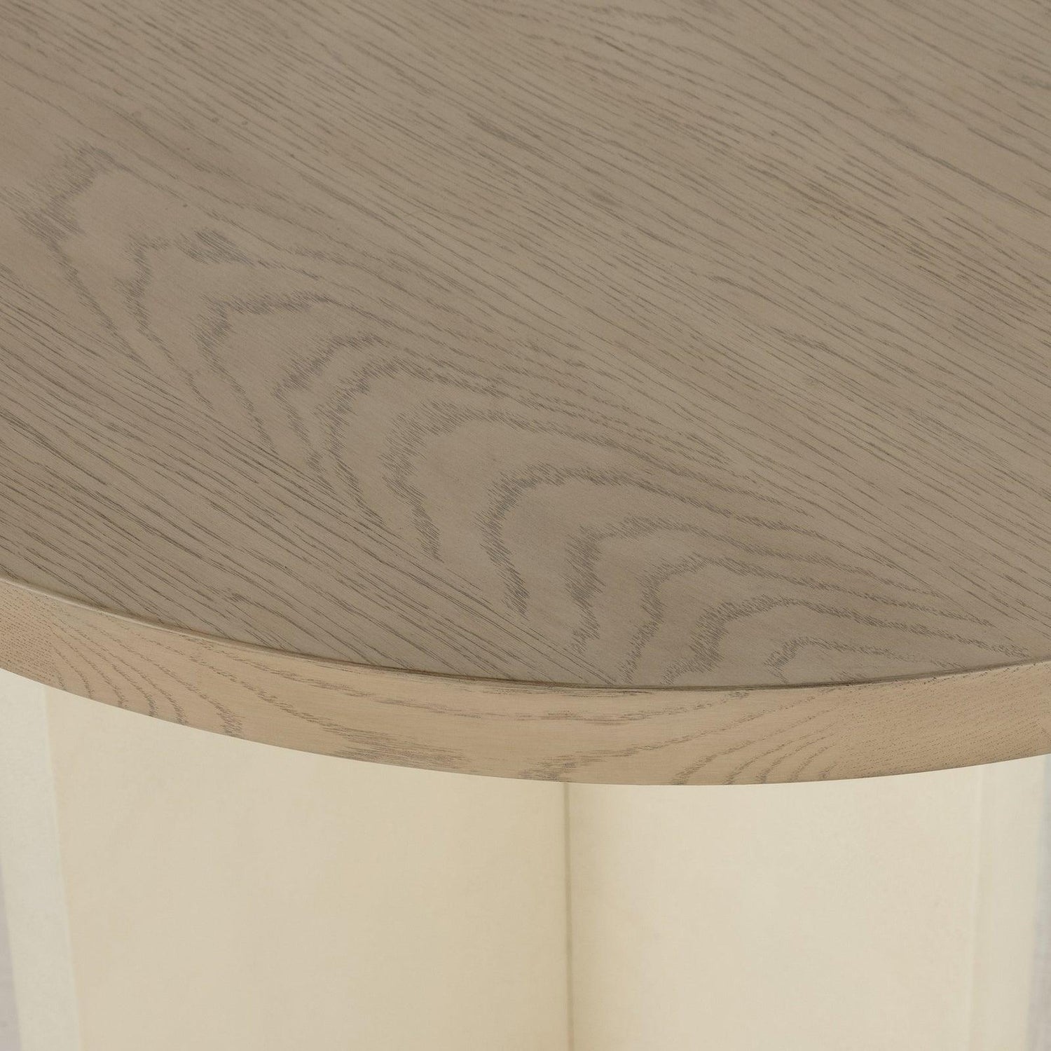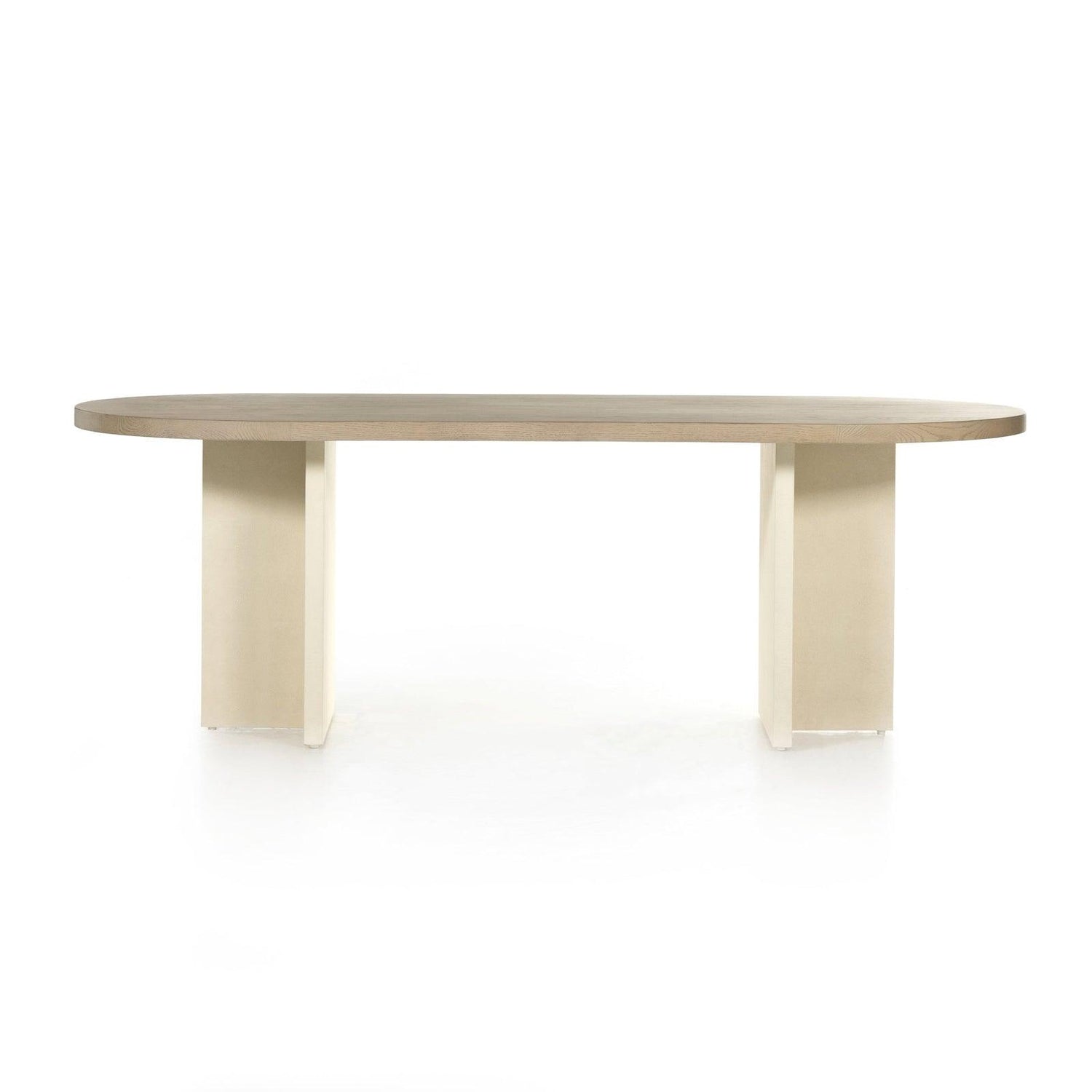 - El cuero sintético de color crema forma lujosas patas en forma de T para una mesa ovalada con forma de roble, creando un aspecto texturizado con aires de mediados de siglo.