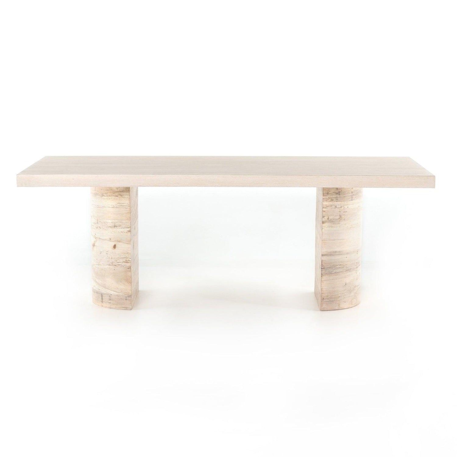 - Inspirada en el audaz diseño de la década de los ochenta, una mesa de comedor rectangular de chapa de roble grueso presenta patas de bella forma en un acabado blanqueado, con una superficie pálida para un sutil contraste de tono.