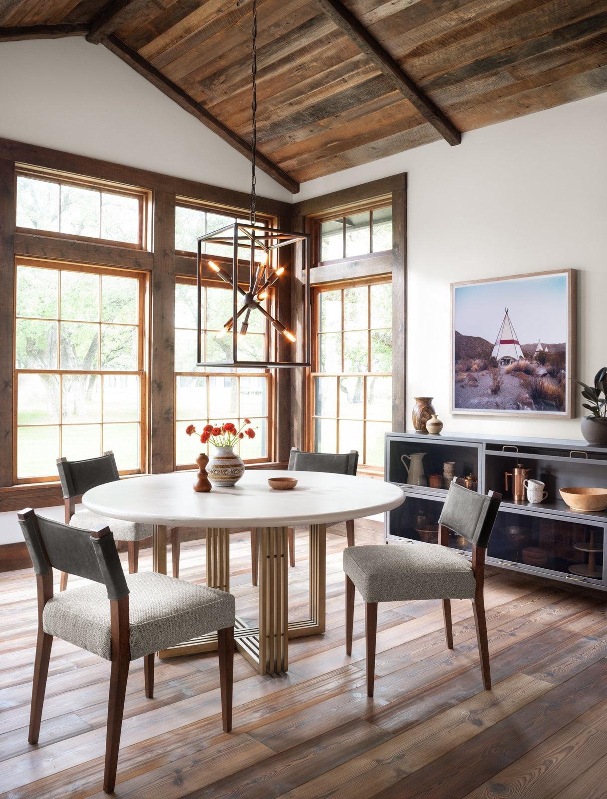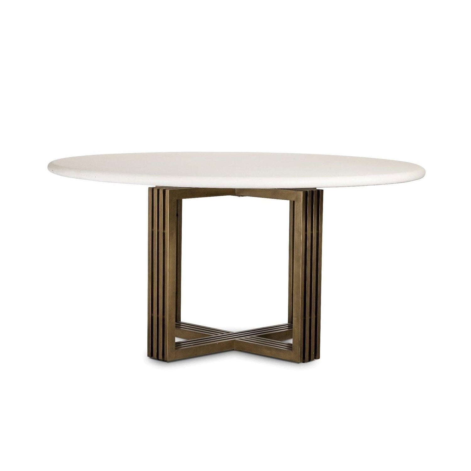 • Las patas con bandas de acero con acabado de latón sostienen una mesa redondeada, mientras que un brillo intenso realza la textura y el tono naturales del hormigón blanco.