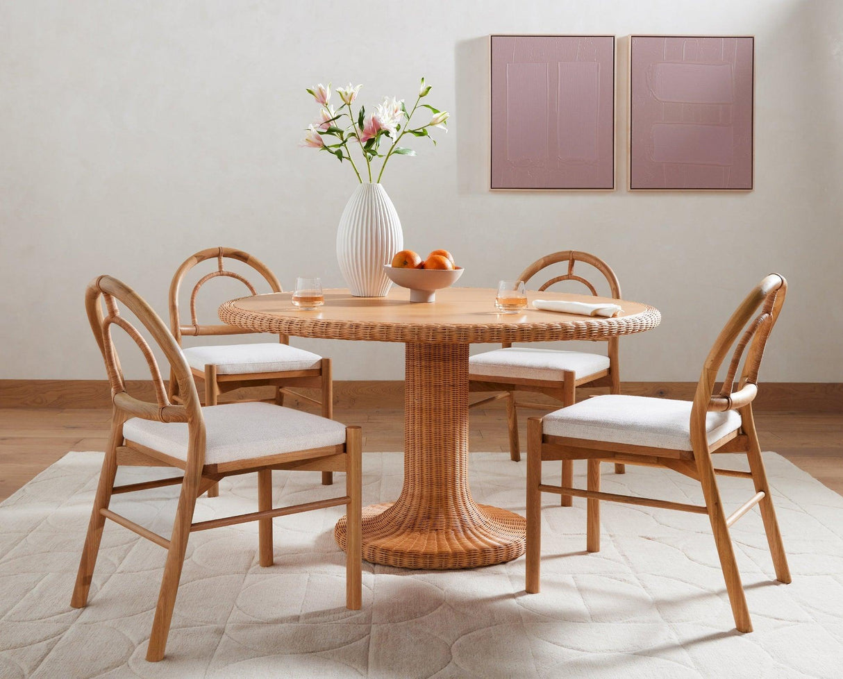 - El roble macizo forma un hermoso marco arqueado, con detalles de caña envueltos a mano en el respaldo y un asiento tapizado para una comodidad lujosa.