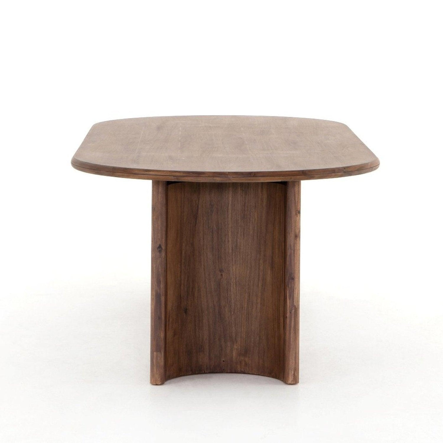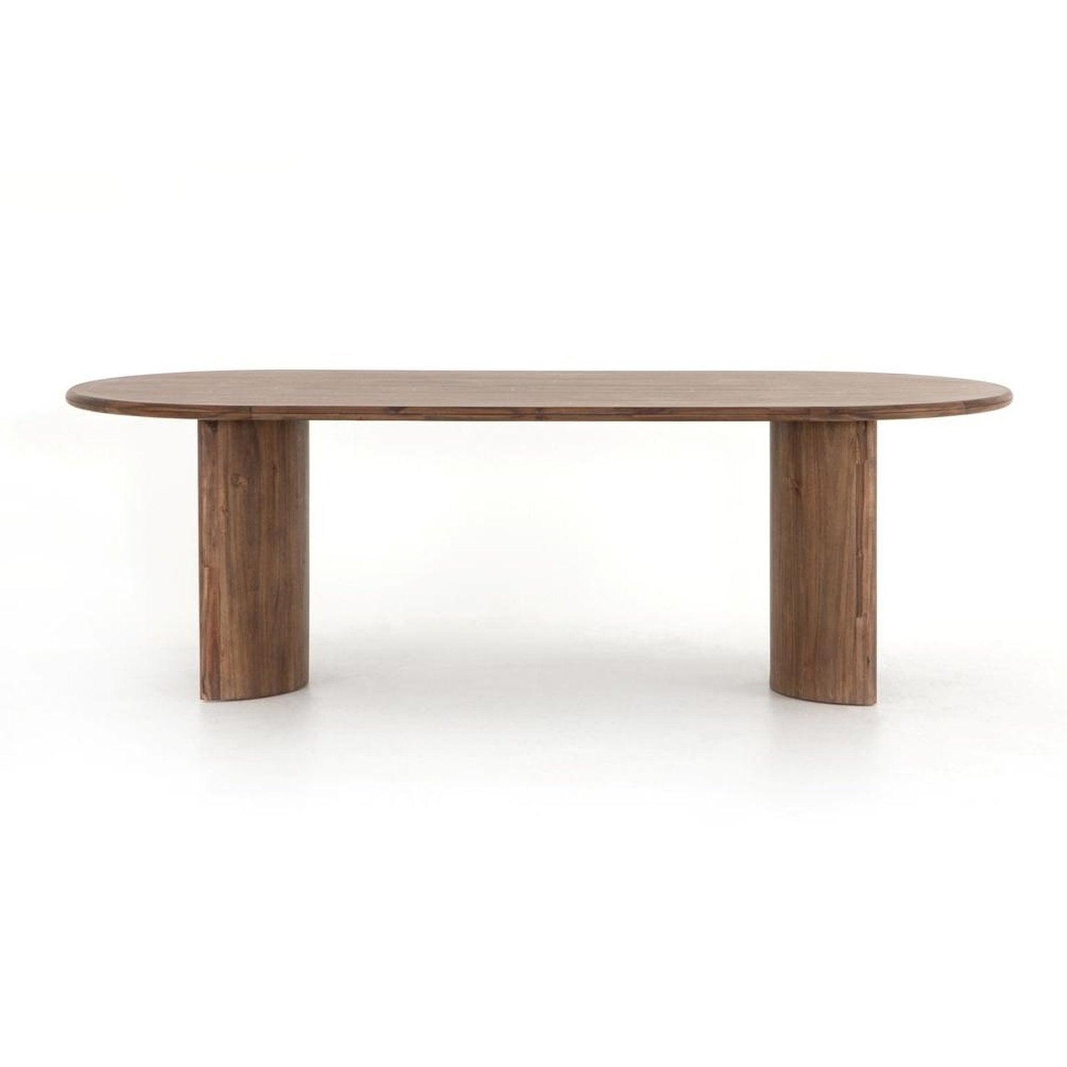 • La acacia marrón sólida forma patas en forma de media luna y un amplio tablero ovalado, aportando una presencia orgánica al comedor.